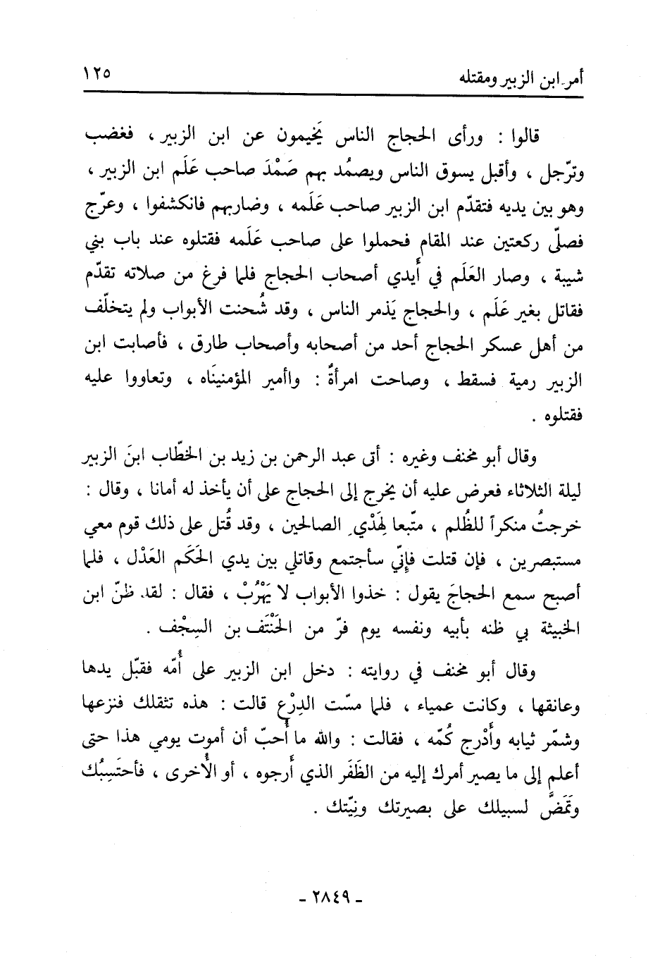 وَقَالَ أَبُو مخنف فِي روايته: دخل ابْن الزُّبَيْرِ عَلَى أمه فقبل يدها وعانقها، وكانت عمياء، فلما مست الدرع قالت: هذه تثقلك فنزعها وشمر ثيابه وأدرج كمه، فقالت: والله مَا أحب أن أموت يومي هذا حَتَّى أعلم إِلَى مَا يصير أمرك إِلَيْهِ من الظفر الَّذِي أرجوه، أو الأخرى، فأحتسبك وتمض لسبيلك عَلَى بصيرتك ونيتك.