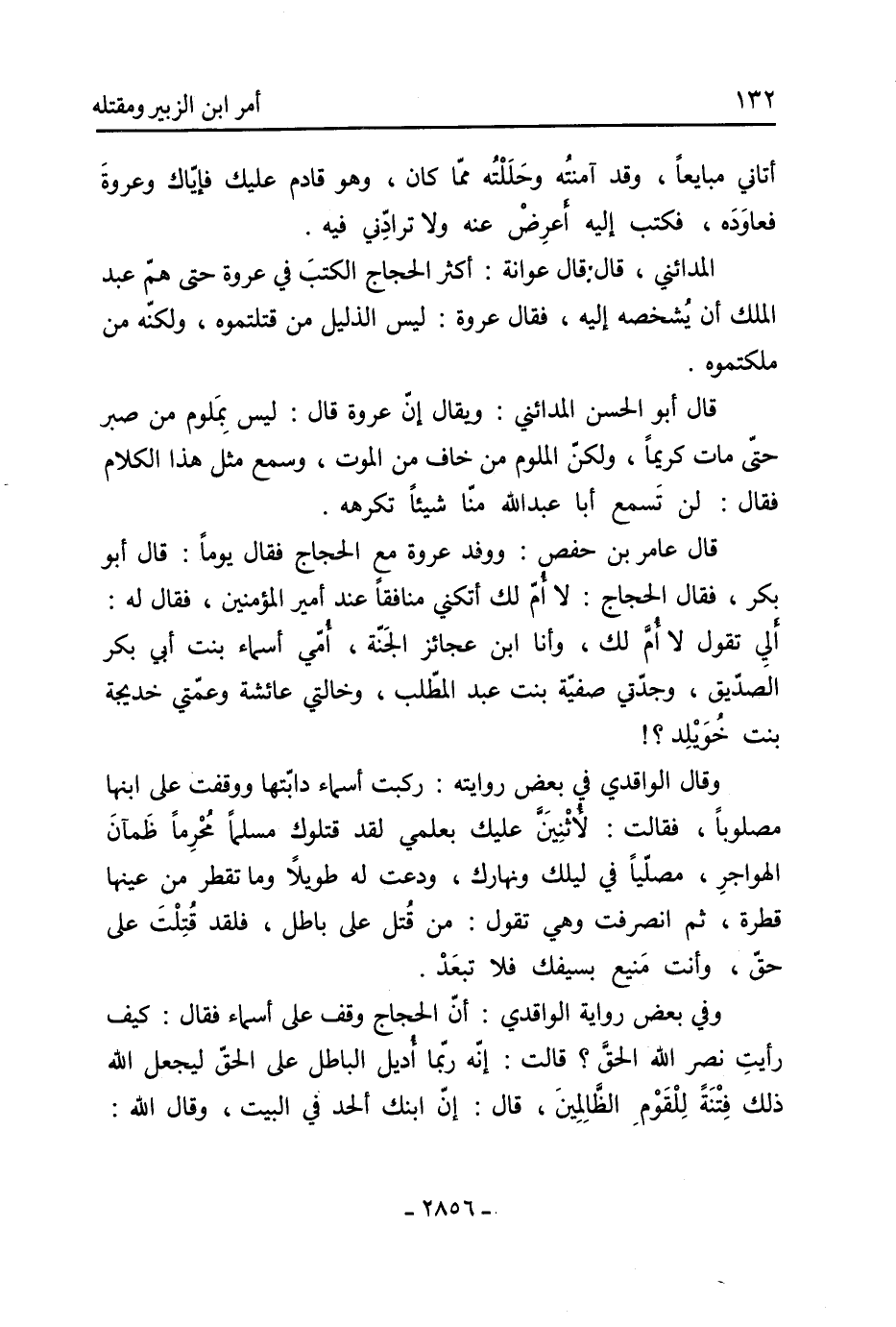 وفي بعض رواية الواقدي: أن الحجاج وقف عَلَى أسماء فَقَالَ: كيف رأيت نصر اللَّه الحق؟ قالت: إنه ربما أديل الباطل عَلَى الحق ليجعل اللَّه ذَلِكَ فتنة للقوم الظالمين، قَالَ: إن ابنك ألحد فِي البيت، وَقَالَ اللَّه: