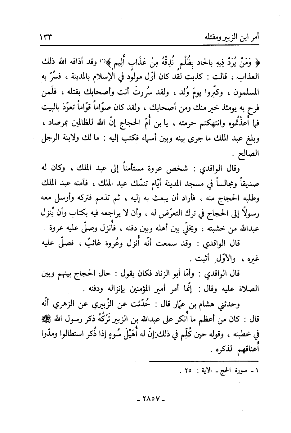 وَمَن يُرِدْ فِيهِ بِإِلْحَادٍ بِظُلْمٍ نُذِقْهُ مِنْ عذاب أليم [1] وقد أذاقه اللَّه ذَلِكَ العذاب، قالت: كذبت لقد كَانَ أول مولود فِي الإسلام بالمدينة، فسر بِهِ المسلمون، وكبروا يوم ولد، ولقد سررت أنت وأصحابك بقتله، فلمن فرح بِهِ يومئذ خير منك ومن أصحابك، ولقد كَانَ صواما قواما تعوذ بالبيت فما أعذتموه وانتهكتم حرمته، يا بن أم الحجاج إن اللَّه للظالمين بمرصاد، وبلغ عَبْد الْمَلِكِ مَا جرى بينه وبين أسماء فكتب إِلَيْهِ: مَا لك ولابنة الرجل الصالح.