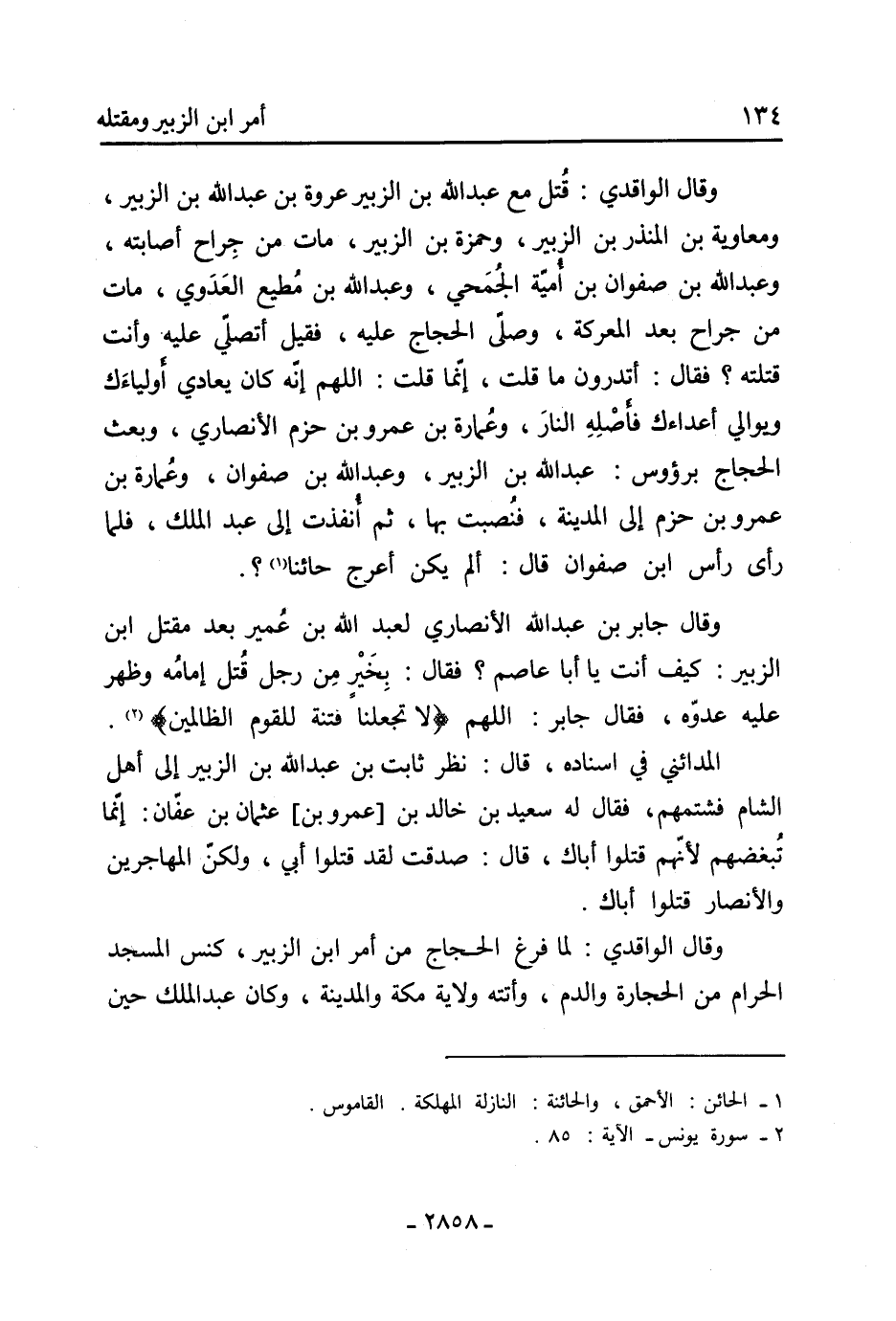 وَقَالَ الواقدي: قتل مَعَ عَبْد اللَّهِ بْن الزُّبَيْرِ عروة بْن عَبْد اللَّهِ بْن الزُّبَيْرِ، ومعاوية بْن المنذر بْن الزُّبَيْرِ، وحمزة بْن الزُّبَيْرِ، مات من جراح أصابته، وَعَبْدُ اللَّهِ بْنُ صَفْوَانَ بْنِ أُمَيَّةَ الْجُمَحِيُّ، وعَبْد اللَّهِ بْن مطيع العدوي، مات من جراح بعد المعركة، وصلّى الحجاج عليه، فقيل أتصلي عَلَيْهِ وأنت قتلته؟ فَقَالَ: أتدرون مَا قلت، إنما قلت: اللهم إنه كَانَ يعادي أولياءك ويوالي أعداءك فأصله النار، وعمارة بْن عمرو بن حزم الأنصاري، وبعث الحجاج برؤوس: عَبْد اللَّهِ بْن الزُّبَيْرِ، وعَبْد اللَّهِ بْن صفوان، وعمارة بْن عَمْرو بْن حزم إِلَى المدينة، فنصبت بِهَا، ثُمَّ أنفذت إِلَى عَبْد الْمَلِكِ، فلما رأى رأس ابْن صفوان قَالَ: ألم يكن أعرج حائنا [1] ؟.