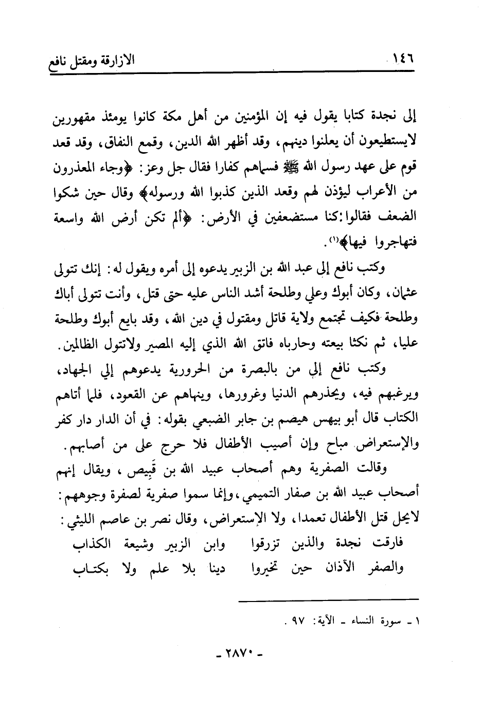 إِلَى نجدة كتابا يقول فيه إن الْمُؤْمِنِينَ من أَهْل مَكَّةَ كانوا يومئذ مقهورين لا يستطيعون أن يعلنوا دينهم، وقد أظهر اللَّه الدين، وقمع النفاق، وقد قعد قوم عَلَى عَهْدِ رَسُول اللَّهِ صَلَّى اللَّهُ عَلَيْهِ وسلم فسماهم كفارا فَقَالَ جل وعز: وَجَاءَ الْمُعَذِّرُونَ مِنَ الأَعْرَابِ لِيُؤْذَنَ لَهُمْ وَقَعَدَ الَّذِينَ كَذَبُوا الله ورسوله وَقَالَ حين شكوا الضعف فَقَالُوا: كنا مستضعفين فِي الأرض: أَلَمْ تَكُنْ أَرْضُ اللَّهِ وَاسِعَةً فتهاجروا فيها [1] وكتب نافع إِلَى عَبْد اللَّهِ بْن الزُّبَيْرِ يدعوه إِلَى أمره ويقول لَهُ: إنك تتولى عثمان، وَكَانَ أبوك وعلي وطلحة أشد النَّاس عَلَيْهِ حَتَّى قتل، وأنت تتولى أباك وطلحة فكيف تجتمع ولاية قاتل ومقتول فِي دين اللَّه، وقد بايع أبوك وطلحة عَلِيًّا، ثُمَّ نكثا بيعته وحارباه فاتق اللَّه الَّذِي إِلَيْهِ المصير ولا تتول الظالمين.