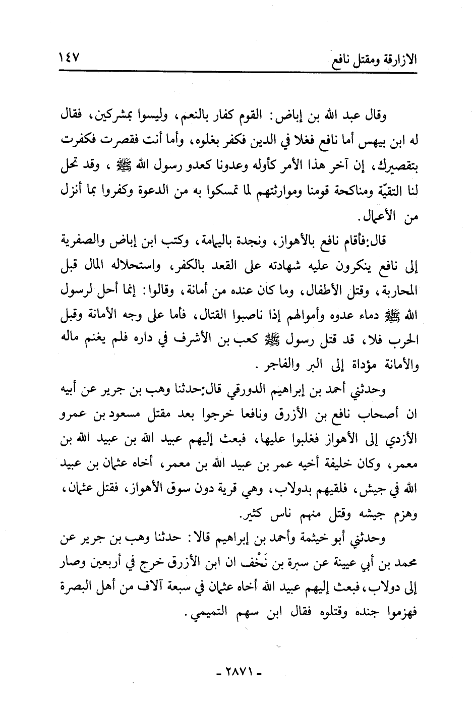 وَحَدَّثَنِي أَبُو خَيْثَمَةَ وَأَحْمَدُ بْنُ إِبْرَاهِيمَ قَالا: حَدَّثَنَا وهب بْن جَرِير عَنْ مُحَمَّد بْن أَبِي عيينة عَن سبرة بْن نخف أن ابْن الأزرق خرج فِي أربعين وصار إِلَى دولاب، فبعث إليهم عبيد اللَّه أخاه عثمان فِي سبعة آلاف من أَهْل البصرة فهزموا جنده وقتلوه فَقَالَ ابْن سهم التميمي.