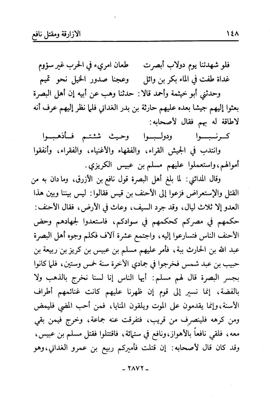 حكمهم فِي مصركم كحكمهم فِي سوادكم، فاستعدوا لجهادهم وحض الأحنف النَّاس فتسارعوا إِلَيْهِ، واجتمع عشرة آلاف فكلم وجوه أَهْل البصرة عَبْد اللَّهِ بْن الحارث ببة، فأمر عليهم مسلم بْن عبيس بْن كريز بْن ربيعة بْن حبيب بْن عبد شمس فخرجوا فِي جمادى الآخرة سنة خمس وستين، فلما كانوا بجسر البصرة قَالَ لهم مسلم: أيها النَّاس إنا لسنا نخرج بالذهب ولا بالفضة، إنما نسير إِلَى قوم إن ظهرنا عليهم كانت غنائمهم أطراف الأسنة، وإنما يقدمون عَلَى الموت ويلقون المنايا، فمن أحب المضي فليمض ومن كرهه فلينصرف من قريب، فتفرقت عنه جماعة، وخرج فيمن بقي مَعَهُ، فلقي نافعا بالأهواز، ونافع في ستمائة، فاقتتلوا فقتل مسلم بْن عبيس، وقد كَانَ قَالَ لأصحابه: إن قتلت فأميركم ربيع بْن عَمْرو الغداني، وهو