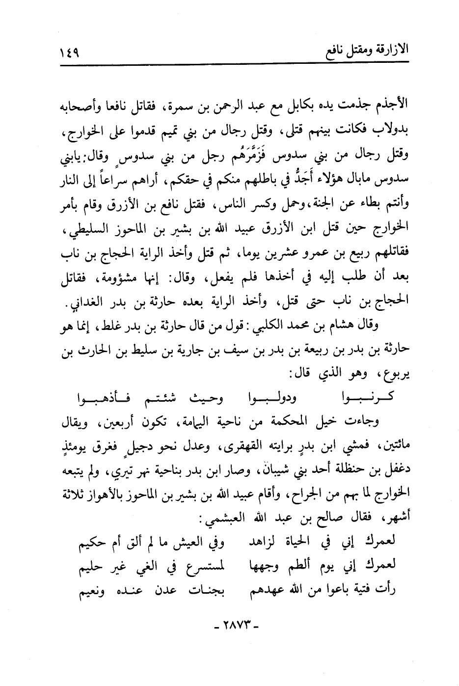 الأجذم جذمت يده بكابل مَعَ عَبْد الرَّحْمَنِ بْن سمرة، فقاتل نافعا وأصحابه بدولاب فكانت بينهم قتلى، وقتل رجال من بني تميم قدموا عَلَى الخوارج، وقتل رجال من بني سدوس فزمرهم رجل من بني سدوس وَقَالَ: يا بني سدوس مَا بال هؤلاء أجد فِي باطلهم منكم فِي حقكم، أراهم سراعا إِلَى النار وأنتم بطاء عَن الجنة، وحمل وكسر النَّاس، فقتل نافع بْن الأزرق وقام بأمر الخوارج حين قتل ابْن الأزرق عبيد اللَّه بْن بشير بْن الماحوز السليطي، فقاتلهم ربيع بْن عَمْرو عشرين يوما، ثُمَّ قتل وأخذ الراية الحجاج بْن ناب بعد أن طلب إِلَيْهِ فِي أخذها فلم يفعل، وَقَالَ: إنها مشؤومة، فقاتل الحجاج بْن ناب حَتَّى قتل، وأخذ الراية بعده حارثة بْن بدر الغداني.