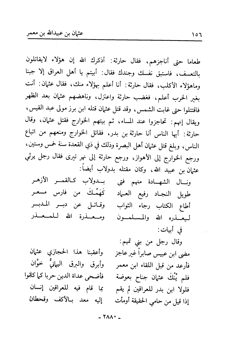 طعاما حَتَّى أناجزهم، فَقَالَ حارثة: أذكرك اللَّه إن هؤلاء لا يقاتلون بالتعسف، فاستبق نفسك وجندك فَقَالَ: أبيتم يَا أَهْل العراق إلا جبنا وما هؤلاء الأكلب، فَقَالَ حارثة: أنا أعلم بهؤلاء منك، فَقَالَ عثمان: أنت بغير الحرب أعلم، فغضب حارثة واعتزل، وناهضهم عثمان بعد الظهر فاقتتلوا حَتَّى غابت الشمس، وقد قتل عثمان قتله ابْن برز مولى عَبْد القيس، ويقال إنهم: تحاجزوا عند المساء، ثُمَّ بيتهم الخوارج فقتل عثمان، وَقَالَ حارثة: أيها النَّاس أنا حارثة بْن بدر، فقاتل الخوارج ومنعهم من اتباع الناس، وبلغ قتل عثمان أَهْل البصرة وذلك فِي ذي القعدة سنة خمس وستين، ورجع الخوارج إِلَى الأهواز، ورجع حارثة إِلَى نهر تيرى فَقَالَ رجل يرثي عثمان بْن عبيد اللَّه، وَكَانَ مقتله بدولاب أيضا: