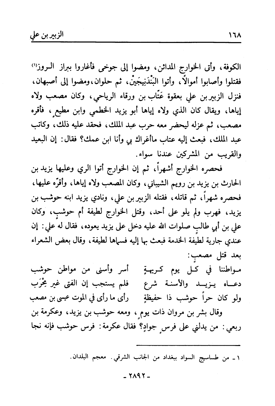 الْكُوفَة، وأتى الخوارج المدائن، ومضوا إِلَى جوخى فأغاروا ببراز الروز [1] فقتلوا وأصابوا أموالا، وأتوا البندنيجين، ثُمَّ حلوان، ومضوا إِلَى أصبهان، فنزل الزُّبَيْر بْن علي بعقوة عتاب بْن ورقاء الرياحي، وَكَانَ مصعب ولاه إياها، ويقال كَانَ الَّذِي ولاه إياها أَبُو يَزِيد الْخَطْمِيّ وابن مطيع، فأقره مصعب، ثُمَّ عزله ليحضر مَعَهُ حرب عَبْد الْمَلِكِ، فحقد عَلَيْهِ ذَلِكَ، وكاتب عَبْد الْمَلِكِ، فبعث إِلَيْهِ عتاب مَا أغراك بي وأنا ابْن عمك؟ فَقَالَ: إن البعيد والقريب من المشركين عندنا سواء.
