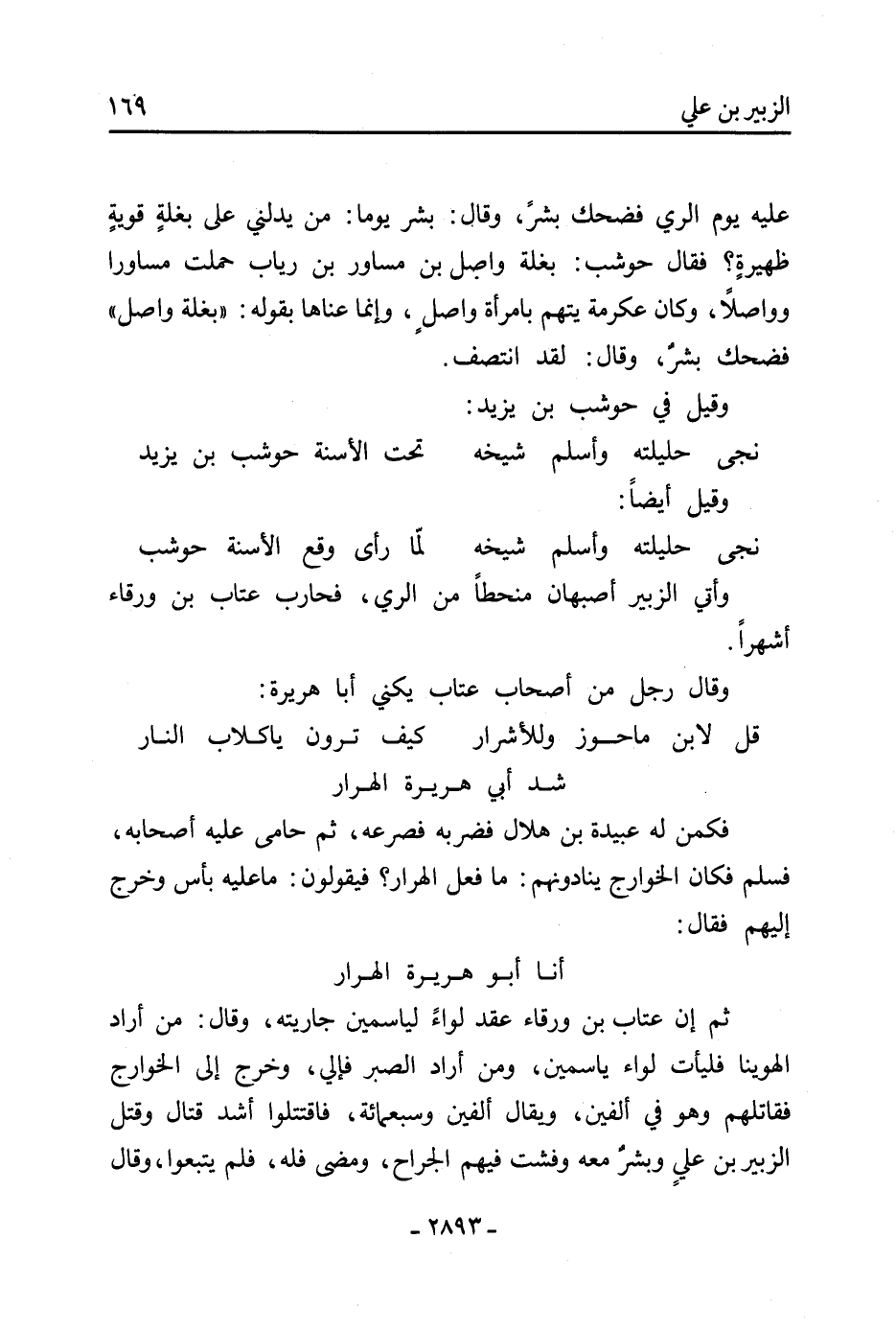 ثُمَّ إن عتاب بْن ورقاء عقد لواء لياسمين جاريته، وَقَالَ: من أراد الهوينا فليأت لواء ياسمين، ومن أراد الصبر فإلي، وخرج إِلَى الخوارج فقاتلهم وهو فِي ألفين، ويقال ألفين وسبعمائة، فاقتتلوا أشد قتال وقتل الزُّبَيْر بْن علي وبشر مَعَهُ وفشت فيهم الجراح، ومضى فله، فلم يتبعوا، وَقَالَ