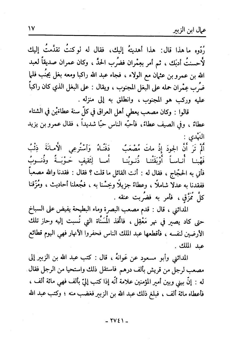 الْمَدَائِنِيُّ وَأَبُو مَسْعُودٍ عَنْ عَوَانَةَ، قَالَ: كَتَبَ عَبْدُ اللَّهِ بْنُ الزُّبَيْرِ إِلَى مُصْعَبٍ لِرَجُلٍ مِنْ قُرَيْشٍ بِأَلْفِ دِرْهَمٍ فَاسْتَقَلَّ ذَلِكَ وَاسْتَحْيَا مِنَ الرَّجُلِ فَقَالَ لَهُ: إِنَّ بَيْنِي وَبَيْنَ أَمِيرِ الْمُؤْمِنِينَ عَلامَةٌ أَنَّهُ إِذَا كَتَبَ إِلَيَّ بِأَلْفٍ فَهِيَ مِائَةُ أَلْفٍ، فَأَعْطَاهُ مِائَةَ أَلْفٍ، فَبَلَغَ ذَلِكَ عَبْدَ اللَّهِ بْنَ الزُّبَيْرِ فَغَضِبَ مِنْهُ، وَكَتَبَ عَبْدُ اللَّهِ
