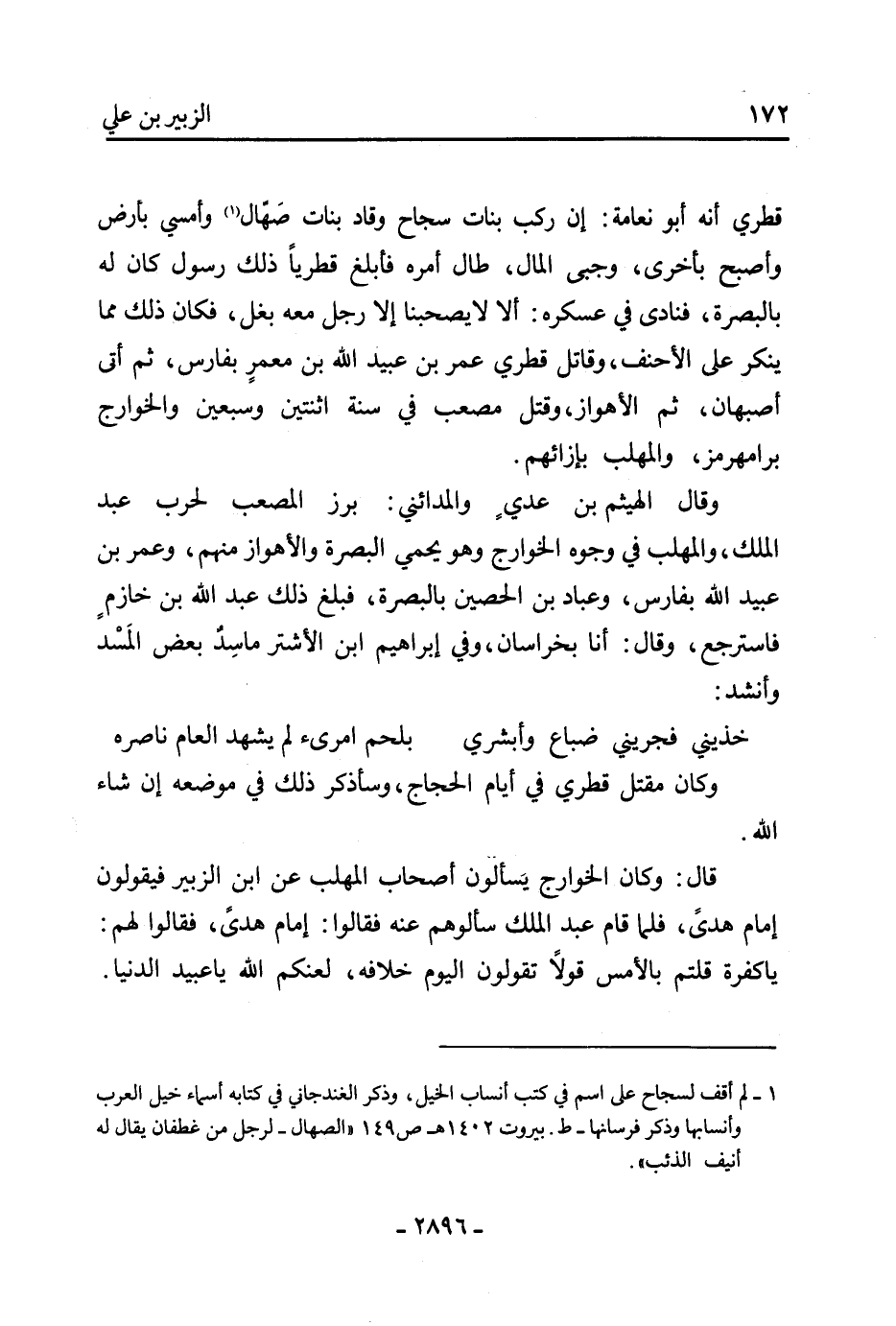 قطري أنه أَبُو نعامة: إن ركب بنات سجاح وقاد بنات صهال [1] وأمسي بأرض وأصبح بأخرى، وجبى المال، طال أمره فأبلغ قطريا ذَلِكَ رسول كَانَ لَهُ بالبصرة، فنادى فِي عسكره: ألا لا يصحبنا إلا رجل مَعَهُ بغل، فكان ذَلِكَ مما ينكر عَلَى الأحنف، وقاتل قطري عمر بْن عبيد اللَّه بْن معمر بفارس، ثُمَّ أتى أصبهان، ثُمَّ الأهواز، وقتل مصعب فِي سنة اثنتين وسبعين والخوارج برامهرمز، والمهلب بإزائهم.