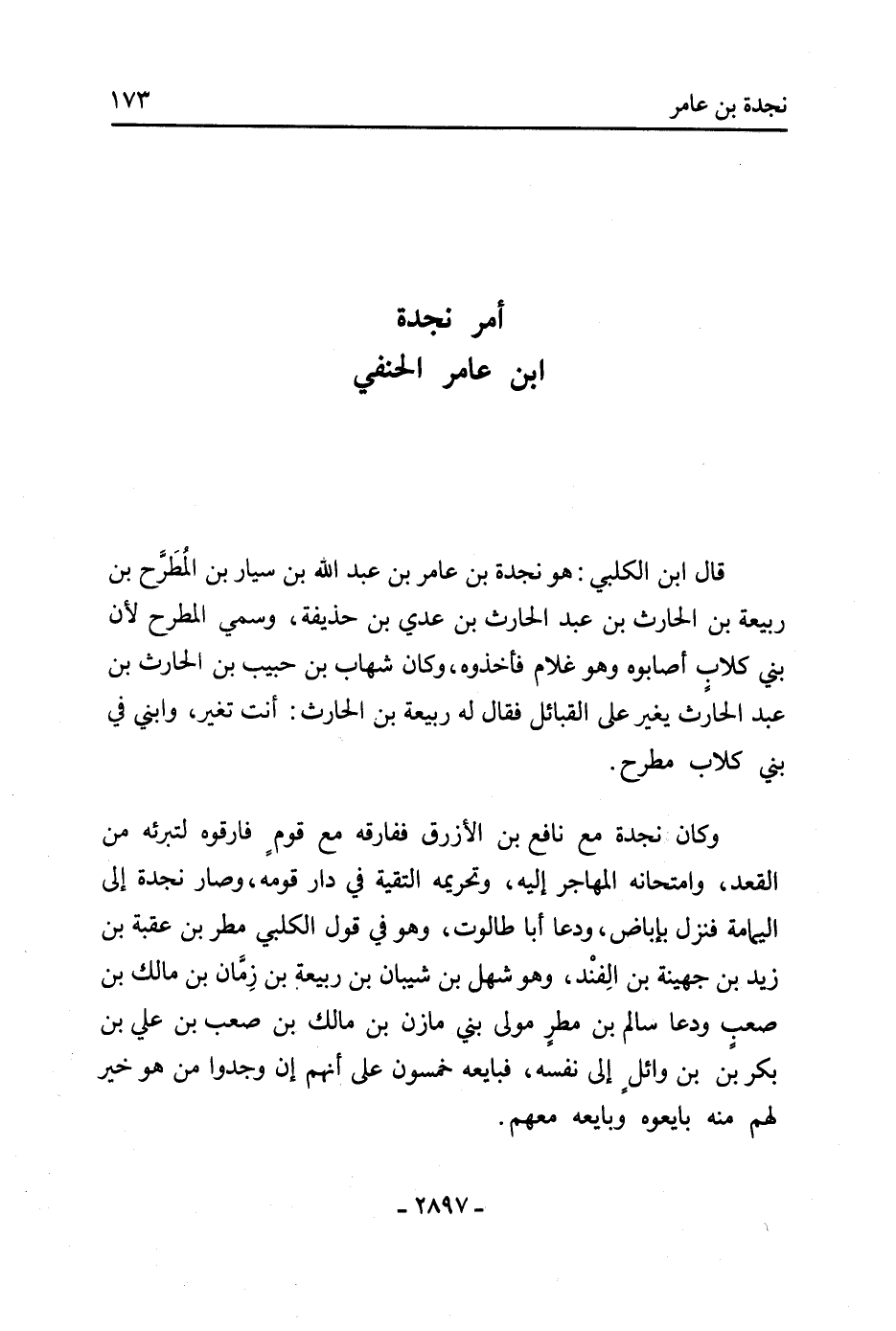 وَكَانَ نجدة مَعَ نافع بْن الأزرق ففارقه مَعَ قوم فارقوه لتبرئه من القعد، وامتحانه المهاجر إِلَيْهِ، وتحريمه التقية فِي دار قومه، وصار نجدة إِلَى اليمامة فنزل بإباض، ودعا أبا طالوت، وهو فِي قول الْكَلْبِيّ مطر بْن عقبة بْن زيد بْن جهينة بْن الفند، وهو شهل بْن شيبان بْن ربيعة بْن زمان بْن مالك بْن صعب ودعا سالم بْن مطر مولى بني مازن بْن مالك بْن صَعب بْن عَلِيِّ بْنِ بَكْر بْن وائل إِلَى نفسه، فبايعه خمسون عَلَى أنهم إن وجدوا من هو خير لهم منه بايعوه وبايعه معهم.