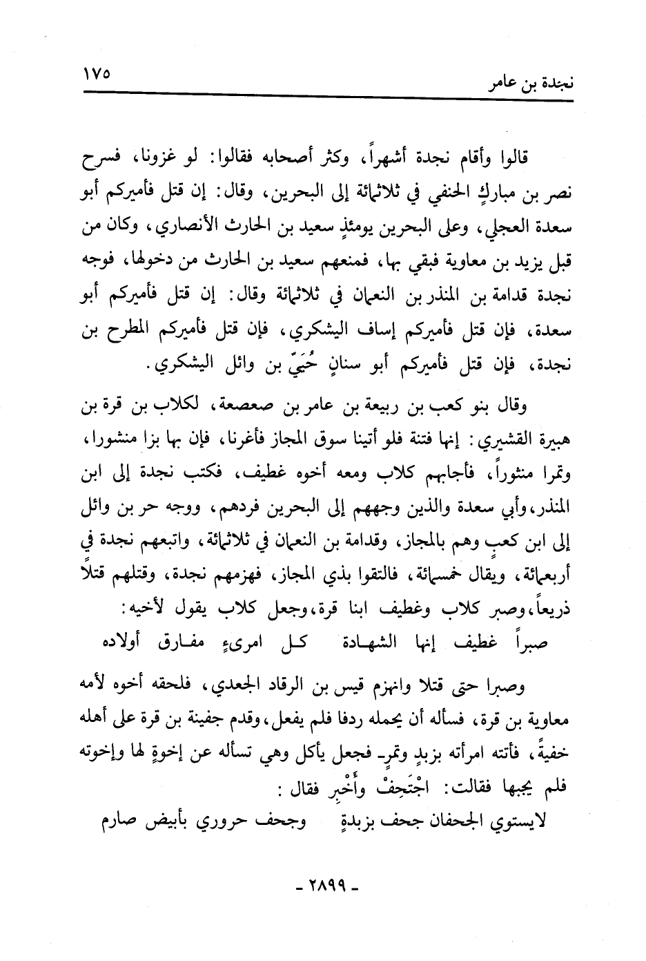 قالوا وأقام نجدة أشهرا، وكثر أصحابه فَقَالُوا: لو غزونا، فسرح نصر بْن مبارك الحنفي في ثلاثمائة إِلَى البحرين، وَقَالَ: إن قتل فأميركم أَبُو سعدة العجلي، وعلى البحرين يومئذ سعيد بْن الحارث الأَنْصَارِيّ، وَكَانَ من قبل يَزِيد بْن مُعَاوِيَةَ فبقي بِهَا، فمنعهم سعيد بْن الحارث من دخولها، فوجه نجدة قدامة بْن المنذر بن النعمان في ثلاثمائة وَقَالَ: إن قتل فأميركم أَبُو سعدة، فإن قتل فأميركم إساف اليشكري، فإن قتل فأميركم المطرح بْن نجدة، فإن قتل فأميركم أَبُو سنان حيي بْن وائل اليشكري.
