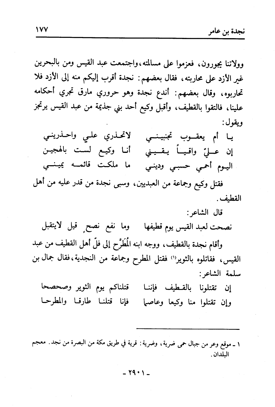 وولاتنا يجورون، فعزموا عَلَى مسالمته، واجتمعت عَبْد القيس ومن بالبحرين غير الأزد عَلَى محاربته، فَقَالَ بعضهم: نجدة أقرب إليكم منه إِلَى الأزد فلا تحاربوه، وَقَالَ بعضهم: أندع نجدة وهو حروري مارق تجري أحكامه عَلَيْنَا، فالتقوا بالقطيف، وأقبل وكيع أحد بني جذيمة من عَبْد القيس يرتجز ويقول: