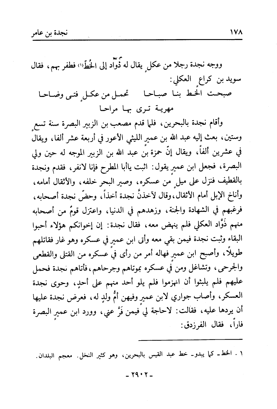 وأقام نجدة بالبحرين، فلما قدم مصعب بْن الزُّبَيْرِ البصرة سنة تسع وستين، بعث إِلَيْهِ عَبْد اللَّهِ بْن عمير الليثي الأعور فِي أربعة عشر ألفا، ويقال فِي عشرين ألفا، ويقال إن حمزة بْن عَبْد اللَّهِ بْن الزُّبَيْرِ الموجه لَهُ حين ولي البصرة، فجعل ابْن عمير يقول: اثبت يا أبا المطرح فإنا لا نفر، فقدم ونجدة بالقطيف فنزل عَلَى ميل من عسكره، وصير البحر خلفه، والأثقال أمامه، وأناخ الإبل أمام الأثقال، وَقَالَ لآخذن نجدة أخذا، وحض نجدة أصحابه، فرغبهم فِي الشهادة والجنة، وزهدهم فِي الدنيا، واعتزل قوم من أصحابه منهم ذواد العكلي فلم ينهض مَعَهُ، فَقَالَ نجدة: إن إخوانكم هؤلاء أحبوا البقاء وثبت نجدة فيمن بقي مَعَهُ وأتى ابْن عمير فِي عسكره وهو غار فقاتلهم طويلا، وأصبح ابْن عمير فهاله أمر من رأى فِي عسكره من القتلى والقطعى والجرحى، وتشاغل ومن فِي عسكره بموتاهم وجرحاهم، فأتاهم نجدة فحمل عليهم فلم يلبثوا أن انهزموا فلم يلو أحد منهم عَلَى أحد، وحوى نجدة العسكر، وأصاب جواري لابن عمير وفيهن أم ولد لَهُ، فعرض نجدة عَلَيْهَا أن يردها عَلَيْهِ، فقالت: لا حاجة لي فيمن فر عني، وورد ابْن عمير البصرة فارا، فقال الفرزدق: