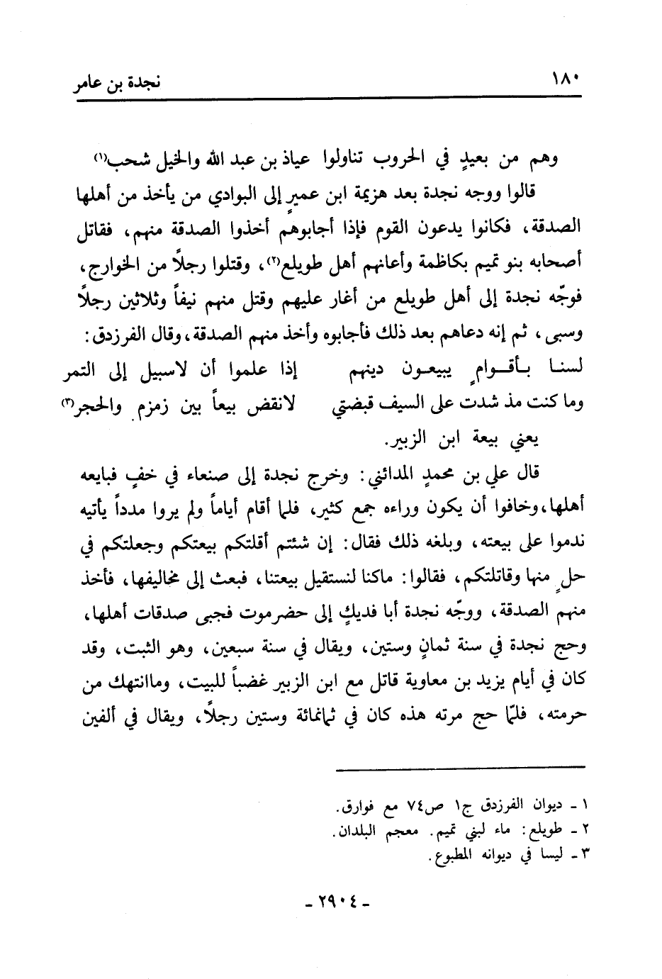 [1] قالوا ووجه نجدة بعد هزيمة ابْن عمير إِلَى البوادي من يأخذ من أهلها الصدقة، فكانوا يدعون القوم فإذا أجابوهم أخذوا الصدقة منهم، فقاتل أصحابه بنو تميم بكاظمة وأعانهم أَهْل طويلع [2] ، وقتلوا رجلا من الخوارج، فوجه نجدة إِلَى أَهْل طويلع من أغار عليهم وقتل منهم نيفا وثلاثين رجلا وسبى، ثُمَّ إنه دعاهم بعد ذَلِكَ فأجابوه وأخذ منهم الصدقة، وَقَالَ الفرزدق: