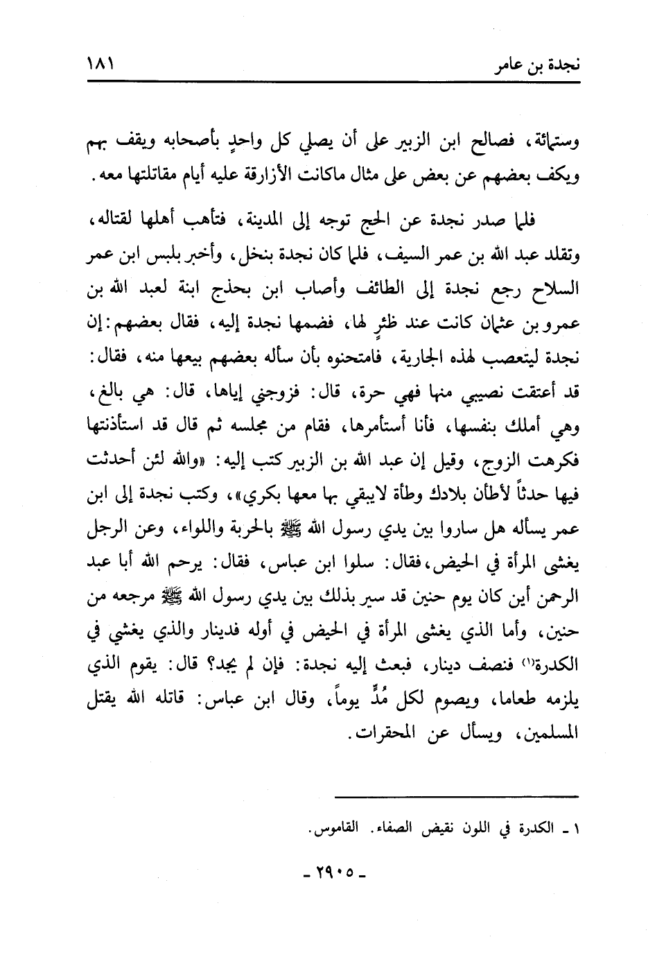 قد أعتقت نصيبي منها فهي حرة، قَالَ: فزوجني إياها، قَالَ: هي بالغ، وهي أملك بنفسها، فأنا أستأمرها، فقام من مجلسه ثُمَّ قَالَ قد استأذنتها فكرهت الزوج، وقيل إن عَبْد اللَّهِ بْن الزُّبَيْرِ كتب إِلَيْهِ: «والله لئن أحدثت فيها حدثا لأطأن بلادك وطأة لا يبقي بِهَا مَعَهَا بكري» ، وكتب نجدة إِلَى ابْن عمر يسأله هل ساروا بَيْنَ يدي رَسُول اللَّهِ صَلَّى اللَّهُ عَلَيْهِ وَسَلَّمَ بالحربة واللواء، وعن الرجل يغشى المرأة فِي الحيض، فَقَالَ: سلوا ابْن عباس، فَقَالَ: يرحم اللَّه أبا عَبْد الرَّحْمَنِ أين كَانَ يوم حنين قد سير بِذَلِكَ بَيْنَ يدي رَسُول اللَّهِ صَلَّى اللَّهُ عَلَيْهِ وَسَلَّمَ مرجعه من حنين، وأما الَّذِي يغشى المرأة فِي الحيض فِي أوله فدينار وَالَّذِي يغشى فِي الكدرة [1] فنصف دينار، فبعث إِلَيْهِ نجدة: فإن لم يجد؟ قَالَ: يقوم الَّذِي يلزمه طعاما، ويصوم لكل مد يوما، وَقَالَ ابْن عباس: قاتله اللَّه يقتل المسلمين، ويسأل عَن المحقرات.