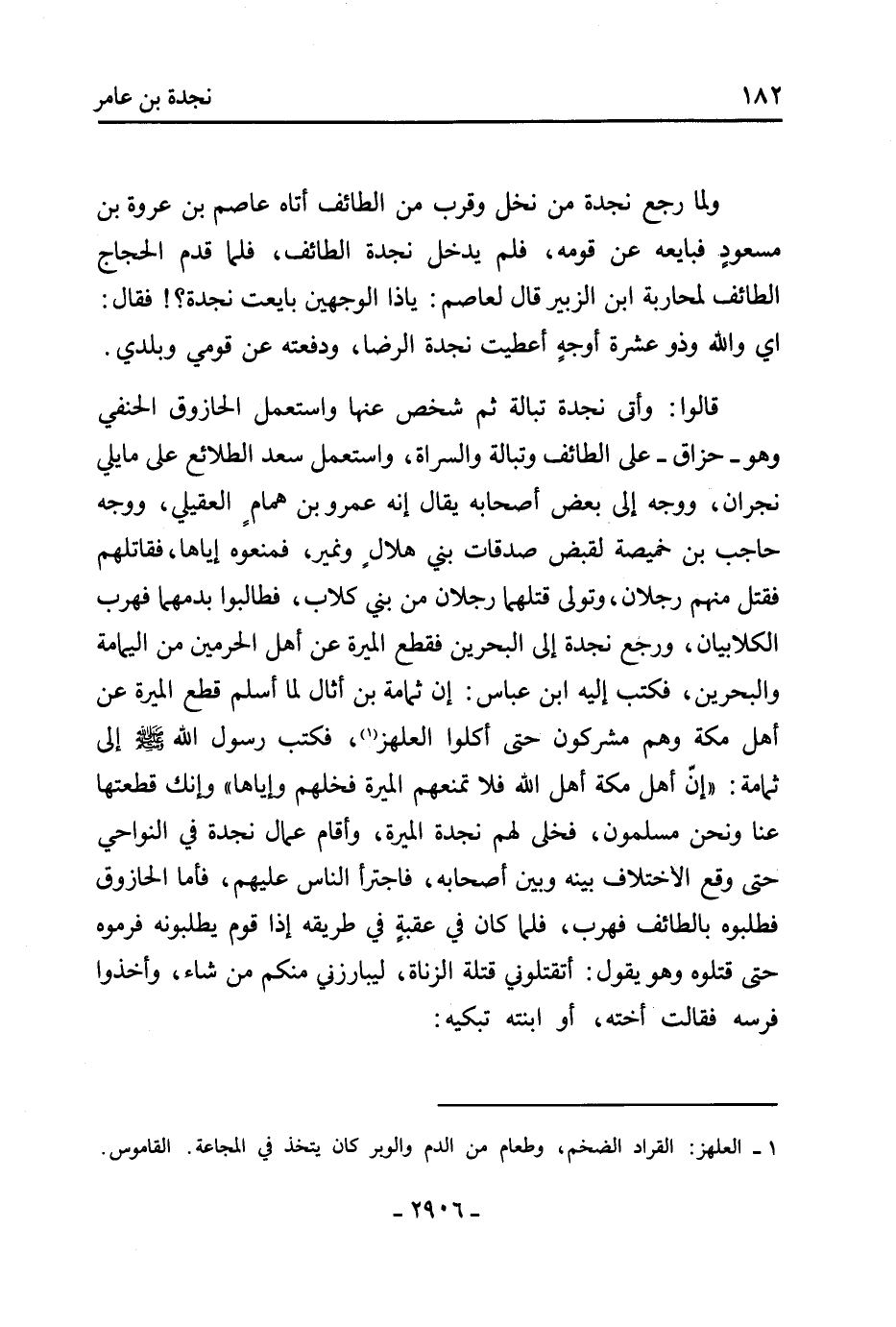 قالوا: وأتى نجدة تبالة ثُمَّ شخص عنها واستعمل الحازوق الحنفي وهو- حزاق- عَلَى الطائف وتبالة والسراة، واستعمل سعد الطلائع على مايلي نجران، ووجه إِلَى بعض أصحابه يقال إنه عَمْرو بْن همام العقيلي، ووجه حاجب بْن خميصة لقبض صدقات بني هلال ونمير، فمنعوه إياها، فقاتلهم فقتل منهم رجلان، وتولى قتلهما رجلان من بني كلاب، فطالبوا بدمهما فهرب الكلابيان، ورجع نجدة إِلَى البحرين فقطع الميرة عَن أَهْل الحرمين من اليمامة والبحرين، فكتب إِلَيْهِ ابْن عباس: إن ثمامة بْن أثال لما أسلم قطع الميرة عَن أَهْل مَكَّةَ وهم مشركون حَتَّى أكلوا العلهز [1] ، فكتب رَسُول اللَّهِ صَلَّى اللَّهُ عَلَيْهِ وَسَلَّمَ إِلَى ثمامة: «إن أَهْل مَكَّةَ أَهْل اللَّه فلا تمنعهم الميرة فخلهم وإياها» وإنك قطعتها عنا ونحن مسلمون، فخلى لهم نجدة الميرة، وأقام عمال نجدة فِي النواحي حَتَّى وقع الاختلاف بينه وبين أصحابه، فاجترأ النَّاس عليهم، فأما الحازوق فطلبوه بالطائف فهرب، فلما كَانَ فِي عقبة فِي طريقه إذا قوم يطلبونه فرموه حَتَّى قتلوه وهو يقول: أتقتلوني قتلة الزناة، ليبارزني منكم من شاء، وأخذوا فرسه فقالت أخته، أو ابنته تبكيه: