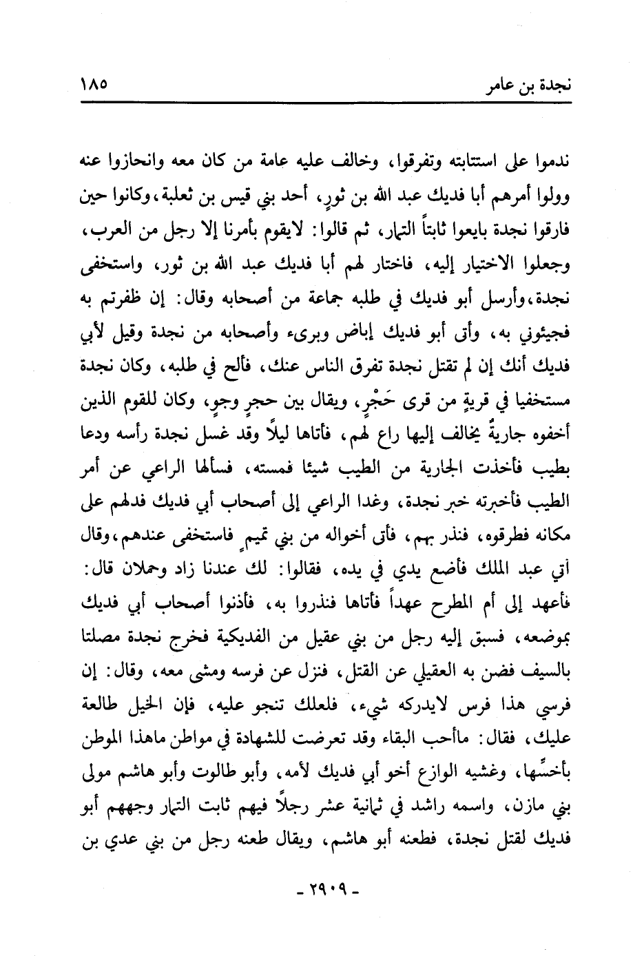 ندموا عَلَى استتابته وتفرقوا، وخالف عَلَيْهِ عامة من كَانَ مَعَهُ وانحازوا عنه وولوا أمرهم أبا فديك عَبْد اللَّهِ بْن ثور، أحد بني قيس بْن ثعلبة، وكانوا حين فارقوا نجدة بايعوا ثابتا التمار، ثُمَّ قالوا: لا يقوم بأمرنا إلا رجل من العرب، وجعلوا الاختيار إِلَيْهِ، فاختار لهم أبا فديك عَبْد اللَّهِ بْن ثور، واستخفى نجدة، وأرسل أَبُو فديك فِي طلبه جماعة من أصحابه وَقَالَ: إن ظفرتم بِهِ فجيئوني بِهِ، وأتى أَبُو فديك إباض وبريء وأصحابه من نجدة وقيل لأبي فديك أنك إن لم تقتل نجدة تفرق النَّاس عنك، فألح في طلبه، وكان نجدة مستخفيا فِي قرية من قرى حجر، ويقال بين حجر وجو، وَكَانَ للقوم الذين أخفوه جارية يخالف إليها راع لهم، فأتاها ليلا وقد غسل نجدة رأسه ودعا بطيب فأخذت الجارية من الطيب شيئا فمسته، فسألها الراعي عَن أمر الطيب فأخبرته خبر نجدة، وغدا الراعي إِلَى أصحاب أَبِي فديك فدلهم عَلَى مكانه فطرقوه، فنذر بهم، فأتى أخواله من بني تميم فاستخفى عندهم، وَقَالَ آتي عَبْد الْمَلِكِ فأضع يدي فِي يده، فَقَالُوا: لك عندنا زاد وحملان قَالَ: