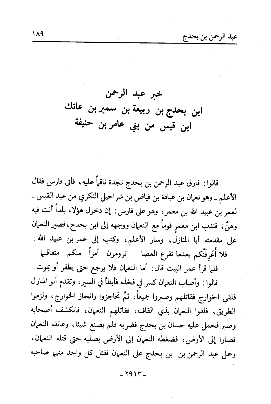 خبر عَبْد الرَّحْمَنِ ابْن بحدج بْن ربيعة بْن سمير بْن عاتك ابْن قيس من بني عامر بْن حنيفة