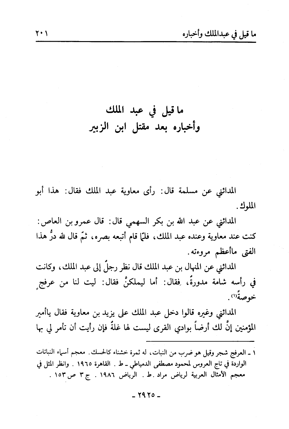 الْمَدَائِنِيّ عَن المنهال بْن عَبْد الْمَلِكِ قَالَ نظر رجل إِلَى عَبْد الْمَلِكِ، وكانت فِي رأسه شامة مدورة، فَقَالَ: أما ليملكن فَقَالَ: ليت لنا من عرفج خوصة [1] .