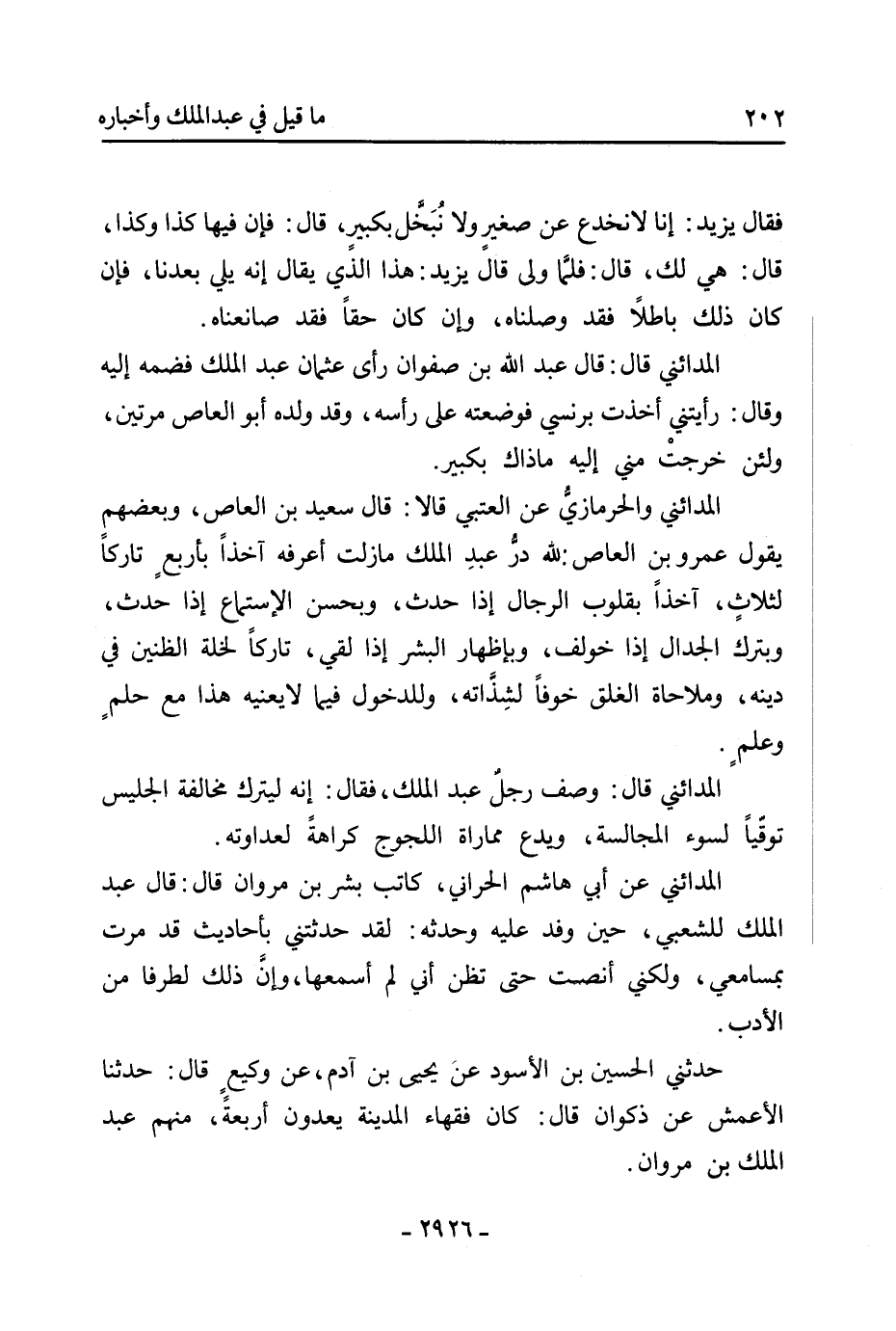 الْمَدَائِنِيّ قَالَ: وصف رجل عَبْد الْمَلِكِ، فَقَالَ: إنه ليترك مخالفة الجليس توقيا لسوء المجالسة، ويدع مماراة اللجوج كراهة لعداوته.