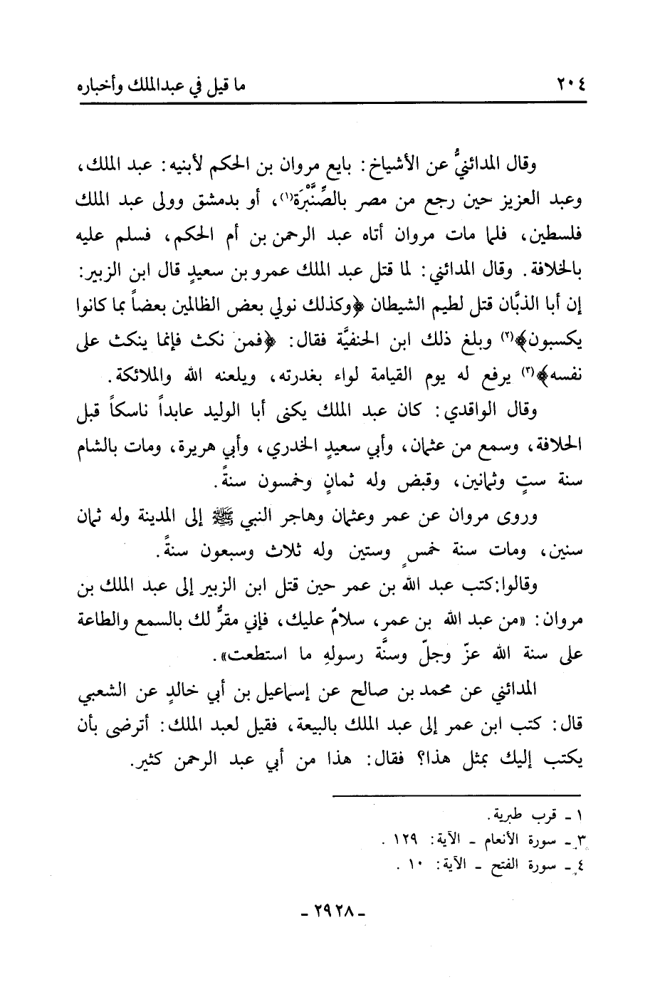 وقالوا: كتب عَبْد اللَّهِ بْن عمر حين قتل ابْن الزُّبَيْرِ إِلَى عَبْد الْمَلِكِ بْن مروان: «من عَبْد اللَّهِ بْن عمر، سلام عليك، فإني مقرّ لك بالسمع والطاعة عن سنة اللَّه عز وجل وسنة رسوله مَا استطعت» .