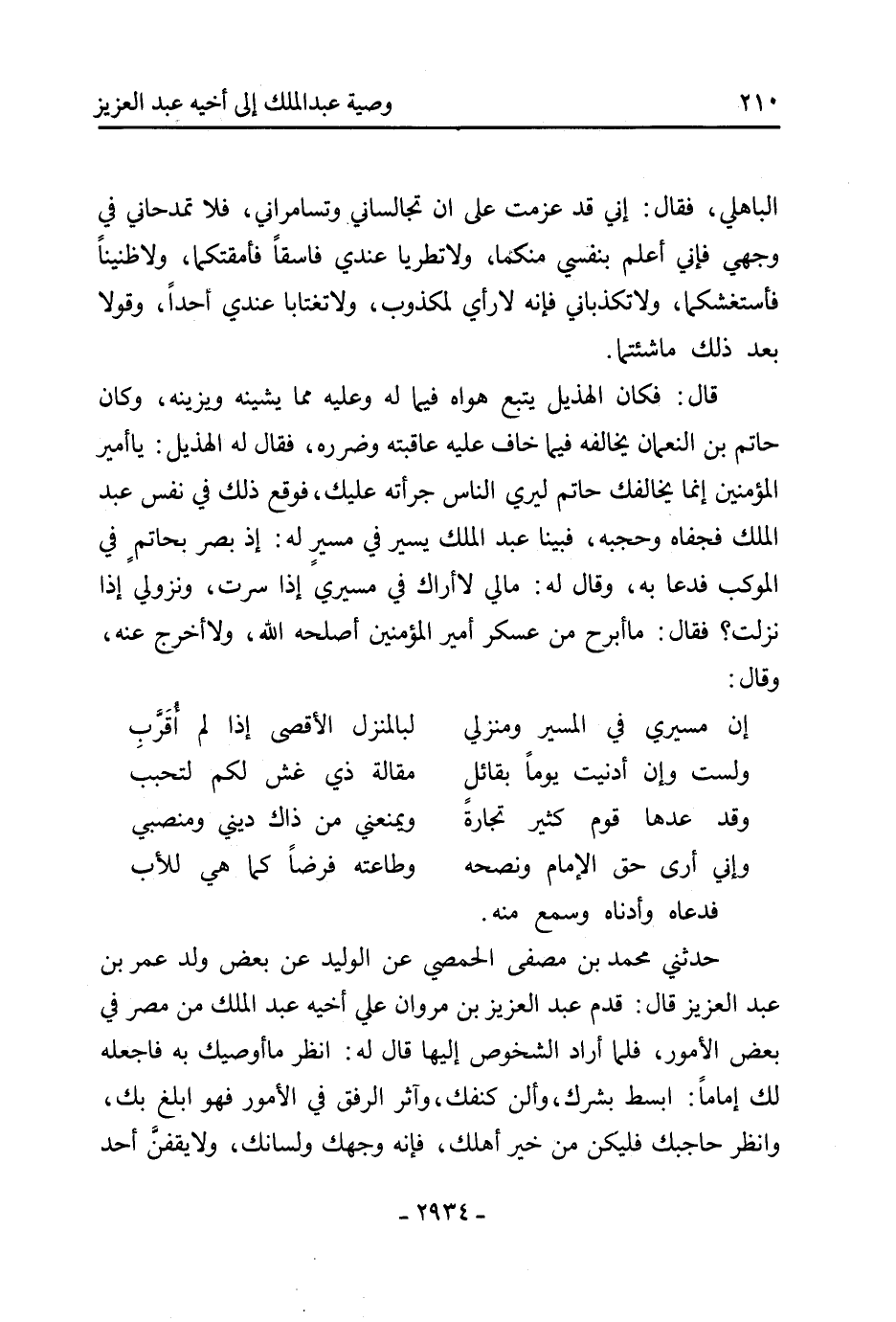 حَدَّثَنِي مُحَمَّد بْن مصفى الحمصي عَن الوليد عَن بعض ولد عمر بْن عَبْد العزيز قَالَ: قدم عَبْد العزيز بْن مروان علي أخيه عَبْد الْمَلِكِ من مصر فِي بعض الأمور، فلما أراد الشخوص إليها قَالَ لَهُ: انظر مَا أوصيك بِهِ فاجعله لك إماما: ابسط بشرك، وألن كنفك، وآثر الرفق فِي الأمور فهو أبلغ بك، وانظر حاجبك فليكن من خير أهلك، فإنه وجهك ولسانك، ولا يقفنّ أحد