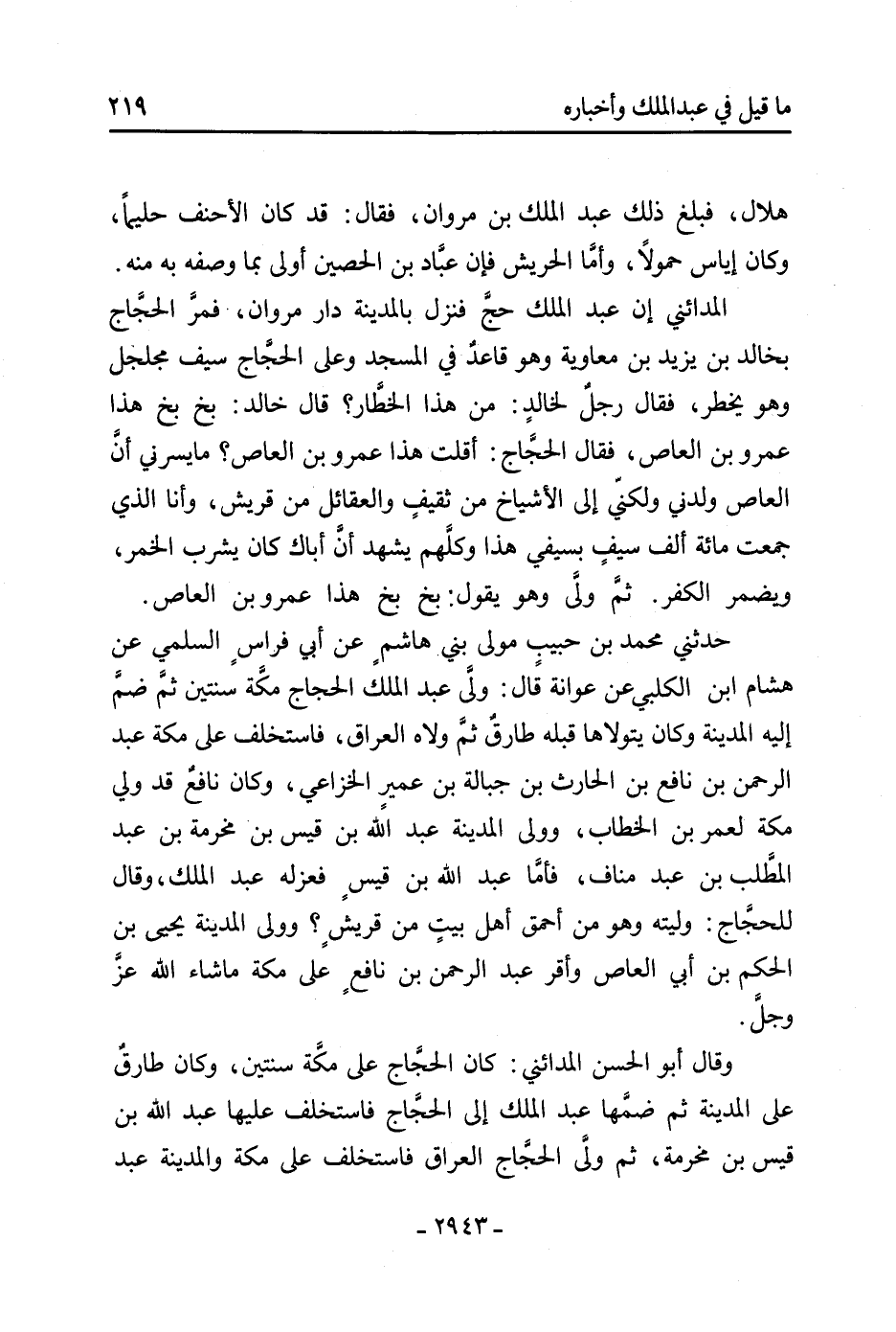حَدَّثَنِي مُحَمَّد بْن حبيب مولى بني هاشم عَن أَبِي فراس السلمي عَن هِشَام ابن الْكَلْبِيّ عَن عوانة قَالَ: ولى عَبْد الْمَلِكِ الحجاج مَكَّة سنتين ثُمَّ ضم إِلَيْهِ المدينة وَكَانَ يتولاها قبله طارق ثُمَّ ولاه العراق، فاستخلف عَلَى مَكَّة عَبْد الرَّحْمَنِ بْن نافع بْن الحارث بْن جبالة بْن عمير الخزاعي، وَكَانَ نافع قد ولي مَكَّة لعمر بْن الخطاب، وولى المدينة عَبْد اللَّهِ بْن قيس بْن مخرمة بْن عَبْد المطلب بْن عبد مناف، فأما عَبْد اللَّهِ بْن قيس فعزله عَبْد الْمَلِكِ، وَقَالَ للحجاج: وليته وهو من أحمق أَهْل بيت من قريش؟ وولى المدينة يَحْيَى بْن الحكم بْن أَبِي العاص وأقر عَبْد الرَّحْمَنِ بْن نافع عَلَى مَكَّة مَا شاء اللَّه عز وجل.