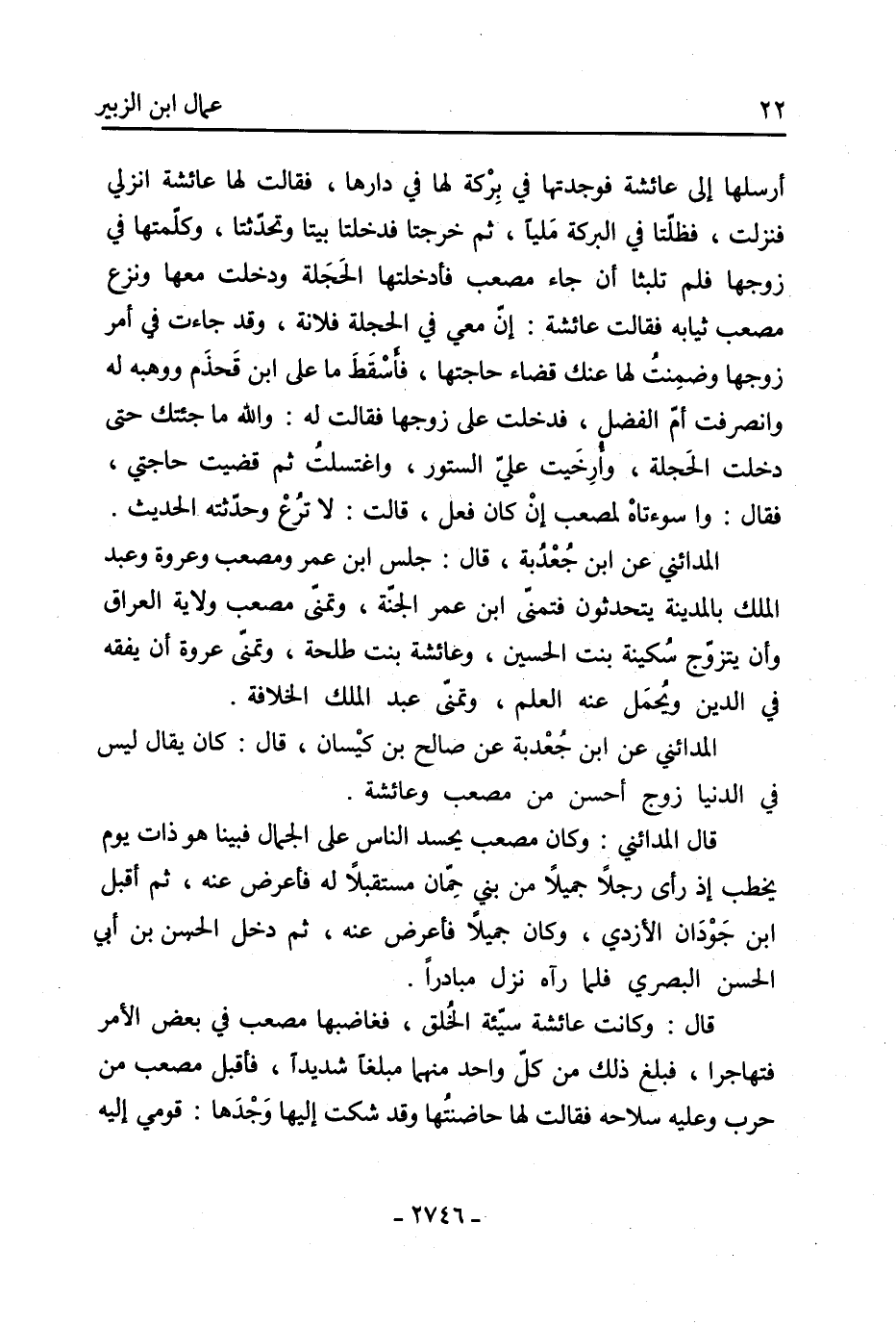 الْمَدَائِنِيّ عَن ابْن جُعْدُبَةَ عَن صَالِحِ بْن كيسان، قَالَ: كَانَ يقال ليس فِي الدنيا زوج أحسن من مصعب وعائشة.