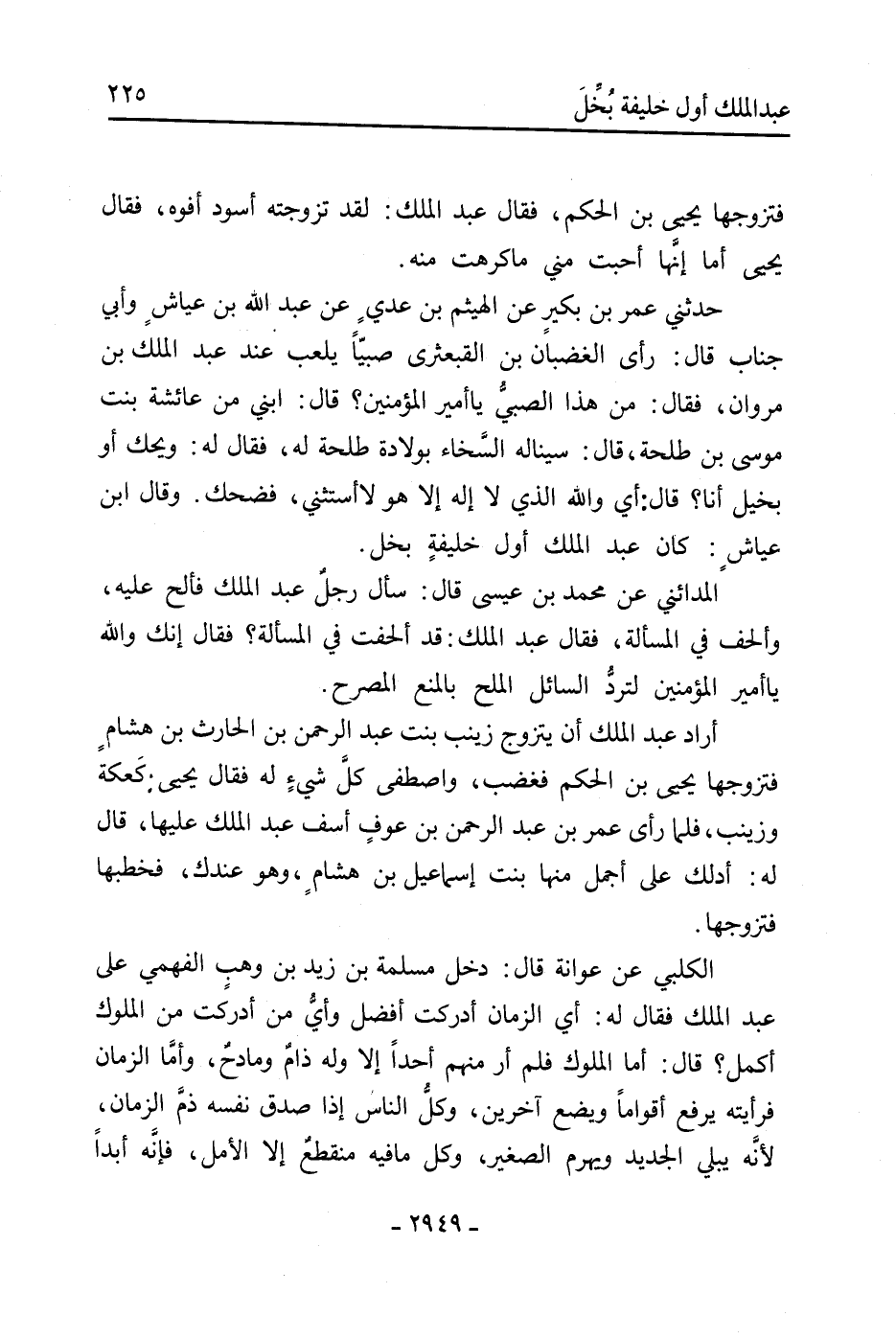 حَدَّثَنِي عُمَرُ بْنُ بُكَيْرٍ عَنِ الْهَيْثَمِ بْنِ عَدِيٍّ عَن عَبْد اللَّهِ بْن عياش وأبي جناب قَالَ: رأى الغضبان بْن القبعثرى صبيا يلعب عند عَبْد الْمَلِكِ بْن مروان، فَقَالَ: من هذا الصبي يَا أَمِيرَ الْمُؤْمِنِينَ؟ قَالَ: ابني من عائشة بنت موسى بْن طلحة، قَالَ: سيناله السخاء بولادة طلحة لَهُ، فَقَالَ لَهُ: ويحك أو بخيل أنا؟ قَالَ: أي والله الذي لا إله إلا هو لا أستثني، فضحك. وَقَالَ ابْن عياش: كَانَ عَبْد الْمَلِكِ أول خليفة بخل.