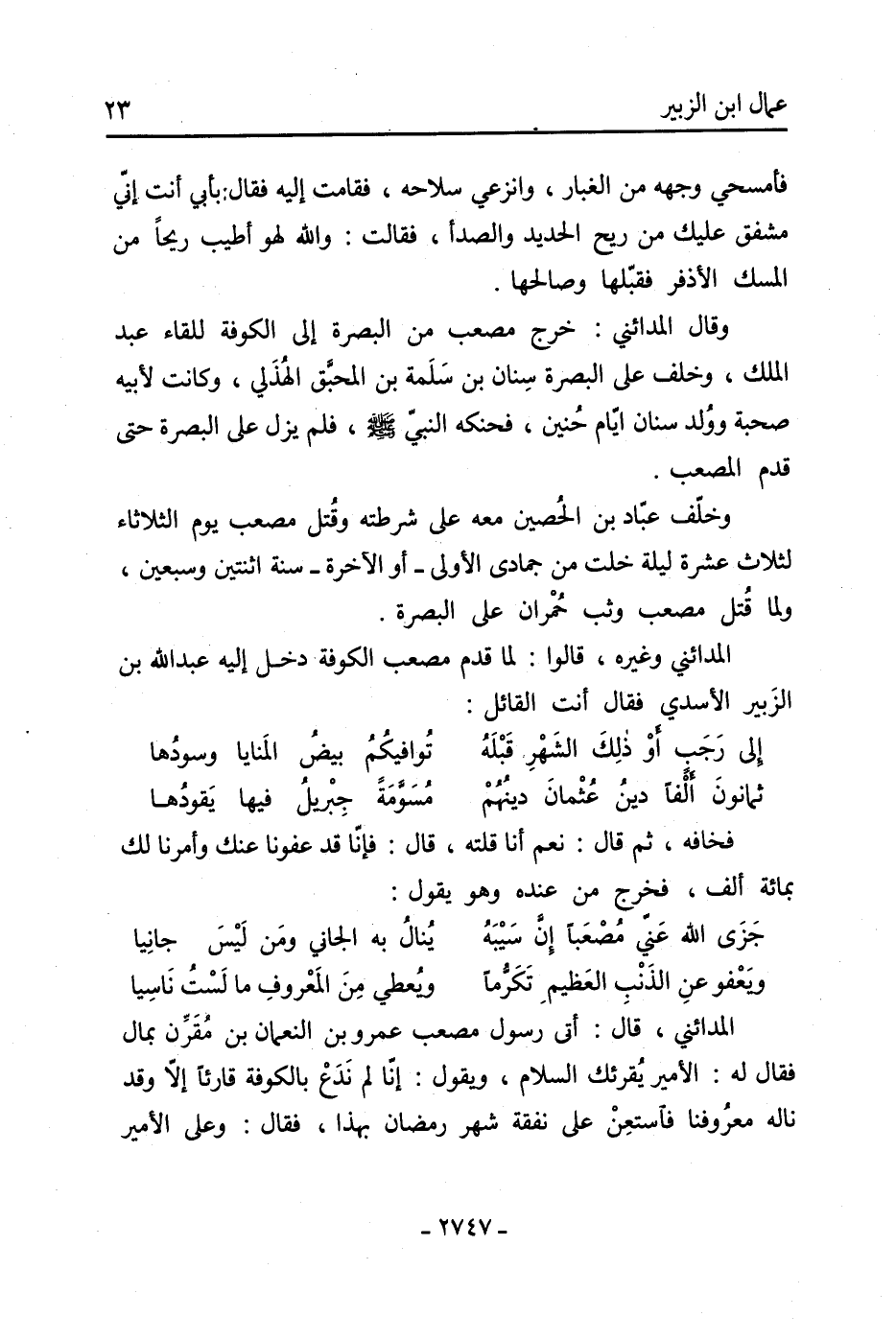 الْمَدَائِنِيّ وغيره، قالوا: لما قدم مصعب الْكُوفَة دخل إِلَيْهِ عَبْد اللَّهِ بْن الزُّبَيْرِ الأسدي فَقَالَ أنت القائل: