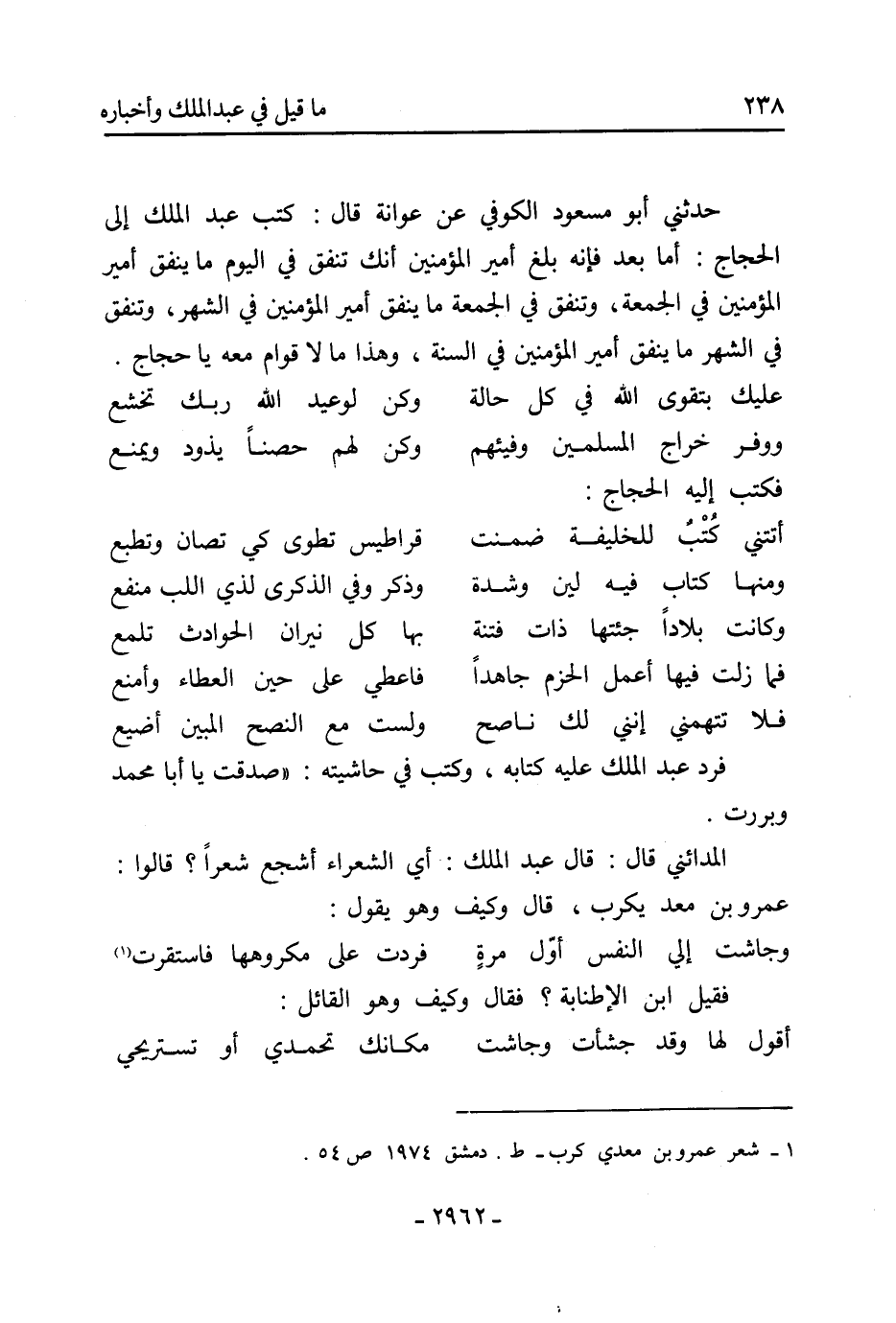 حَدَّثَنِي أَبُو مَسْعُود الكوفي عَنْ عوانة قَالَ: كتب عبد الملك إلى الحجاج: أما بعد فإنه بلغ أَمِير الْمُؤْمِنِينَ أنك تنفق فِي اليوم مَا ينفق أَمِير الْمُؤْمِنِينَ فِي الجمعة، وتنفق فِي الجمعة مَا ينفق أَمِير الْمُؤْمِنِينَ فِي الشهر، وتنفق فِي الشهر مَا ينفق أَمِير الْمُؤْمِنِينَ فِي السنة، وهذا مَا لا قوام مَعَهُ يَا حجاج.