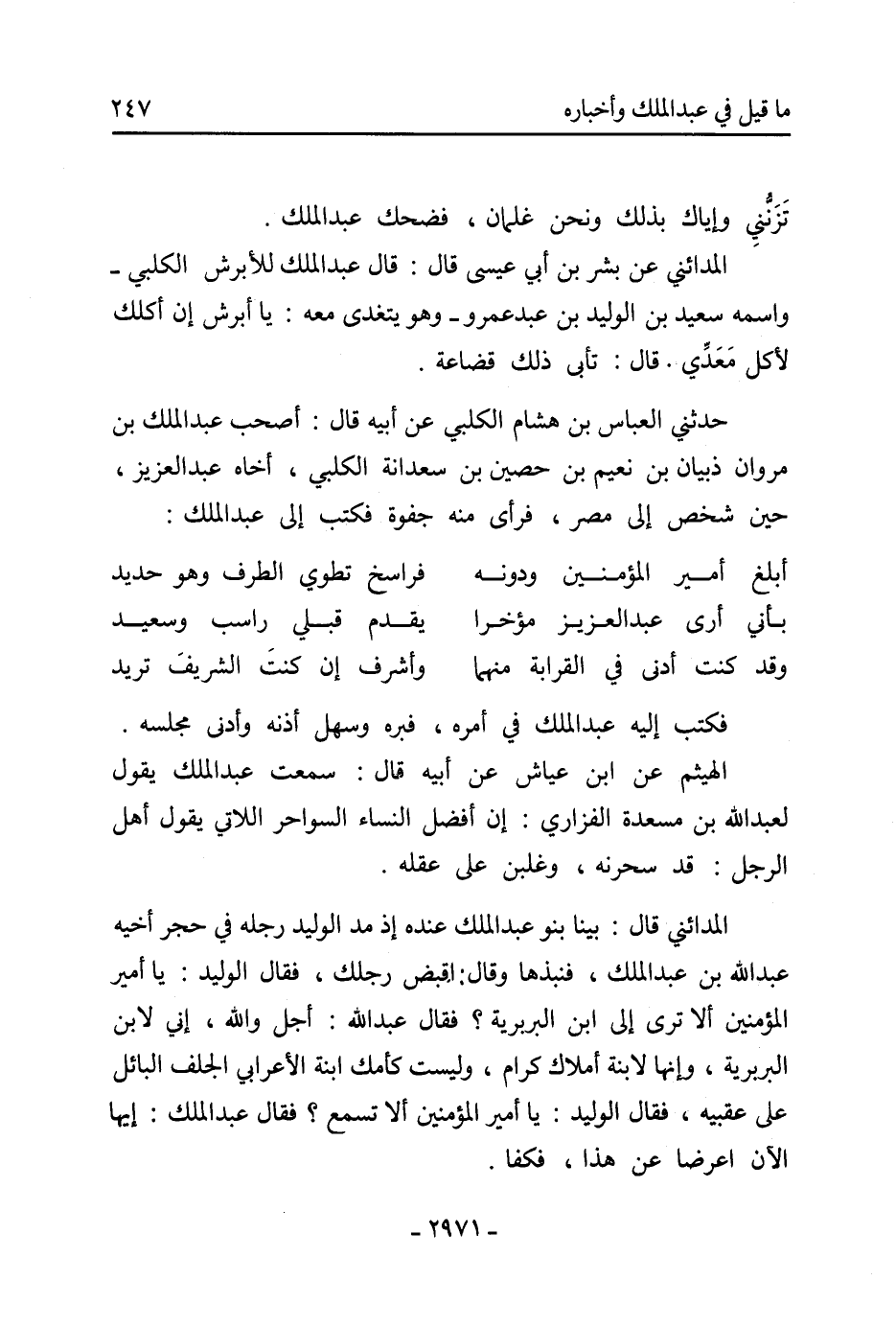 الهيثم عَن ابْن عياش عَن أبيه قَالَ: سمعت عَبْد الْمَلِكِ يقول لعَبْد اللَّهِ بْن مسعدة الفزاري: إن أفضل النساء السواحر اللاتي يقول أَهْل الرجل: قد سحرنه، وغلبن عَلَى عقله.