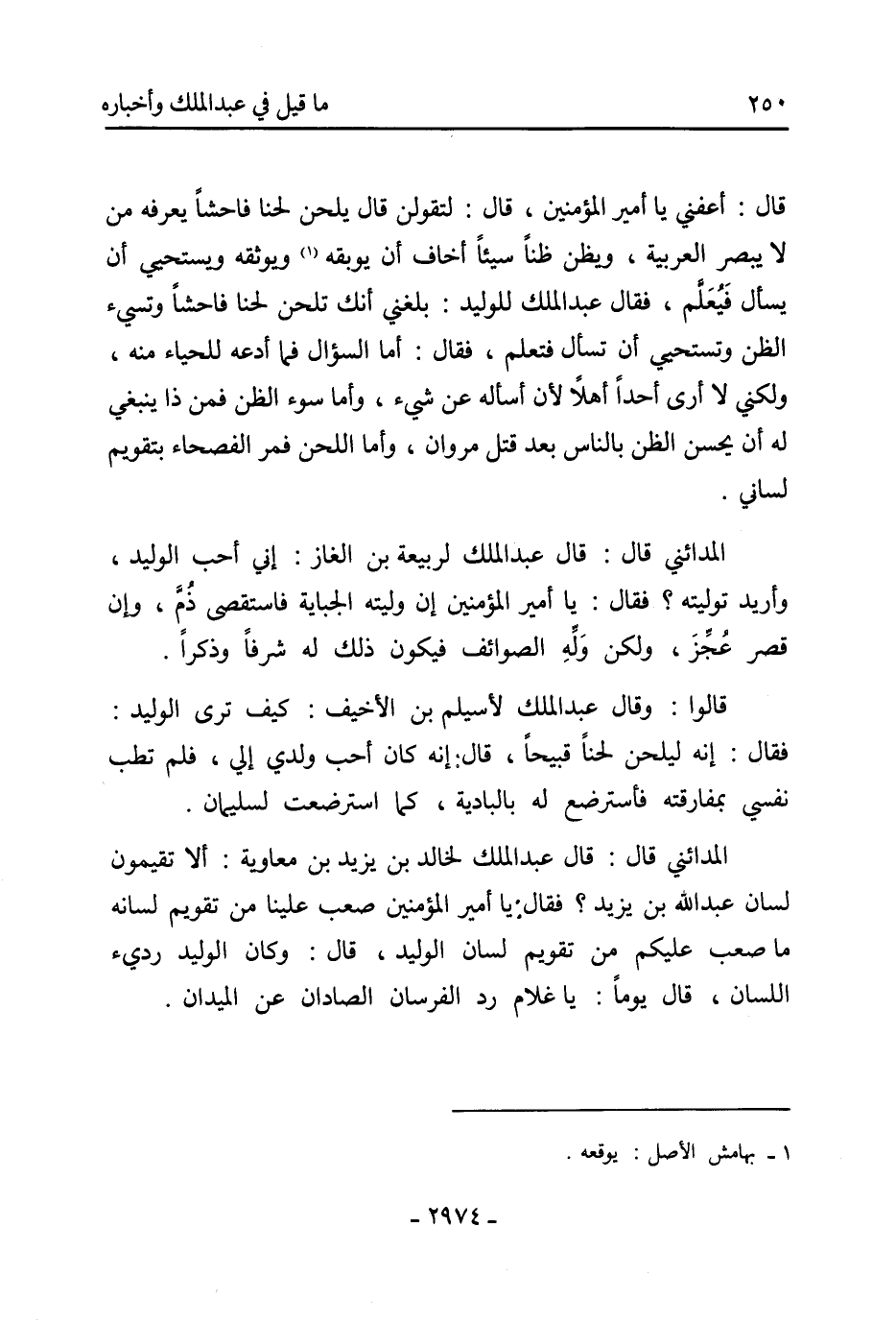 قَالَ: أعفني يَا أَمِيرَ الْمُؤْمِنِينَ، قَالَ: لتقولن قَالَ يلحن لحنا فاحشا يعرفه من لا يبصر العربية، ويظن ظنا سيئا أخاف أن يوبقه [1] ويوثقه ويستحيي أن يسأل فيعلم، فَقَالَ عَبْد الْمَلِكِ للوليد: بلغني أنك تلحن لحنا فاحشا وتسيء الظن وتستحيي أن تسأل فتعلم، فَقَالَ: أما السؤال فما أدعه للحياء منه، ولكني لا أرى أحدا أهلا لأن أسأله عَن شيء، وأما سوء الظن فمن ذا ينبغي لَهُ أن يحسن الظن بالناس بعد قتل مروان، وأما اللحن فمر الفصحاء بتقويم لساني.