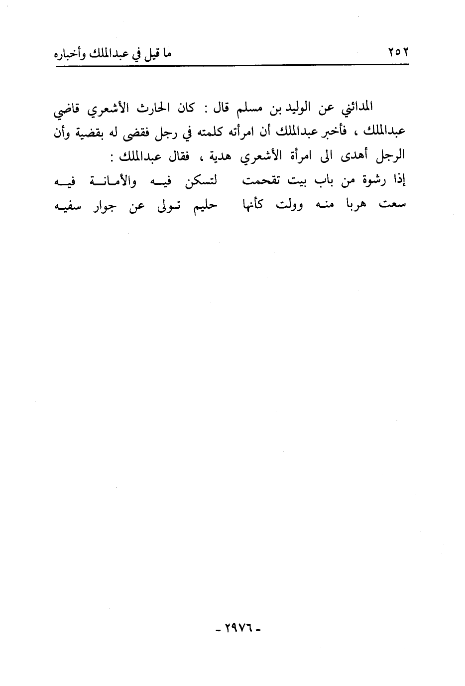 الْمَدَائِنِيّ عَن الوليد بْن مسلم قَالَ: كَانَ الحارث الأشعري قاضي عَبْد الْمَلِكِ، فأخبر عَبْد الْمَلِكِ أن امرأته كلمته فِي رجل فقضى لَهُ بقضية وأن الرجل أهدى إِلَى امرأة الأشعري هدية، فَقَالَ عَبْد الْمَلِكِ:
