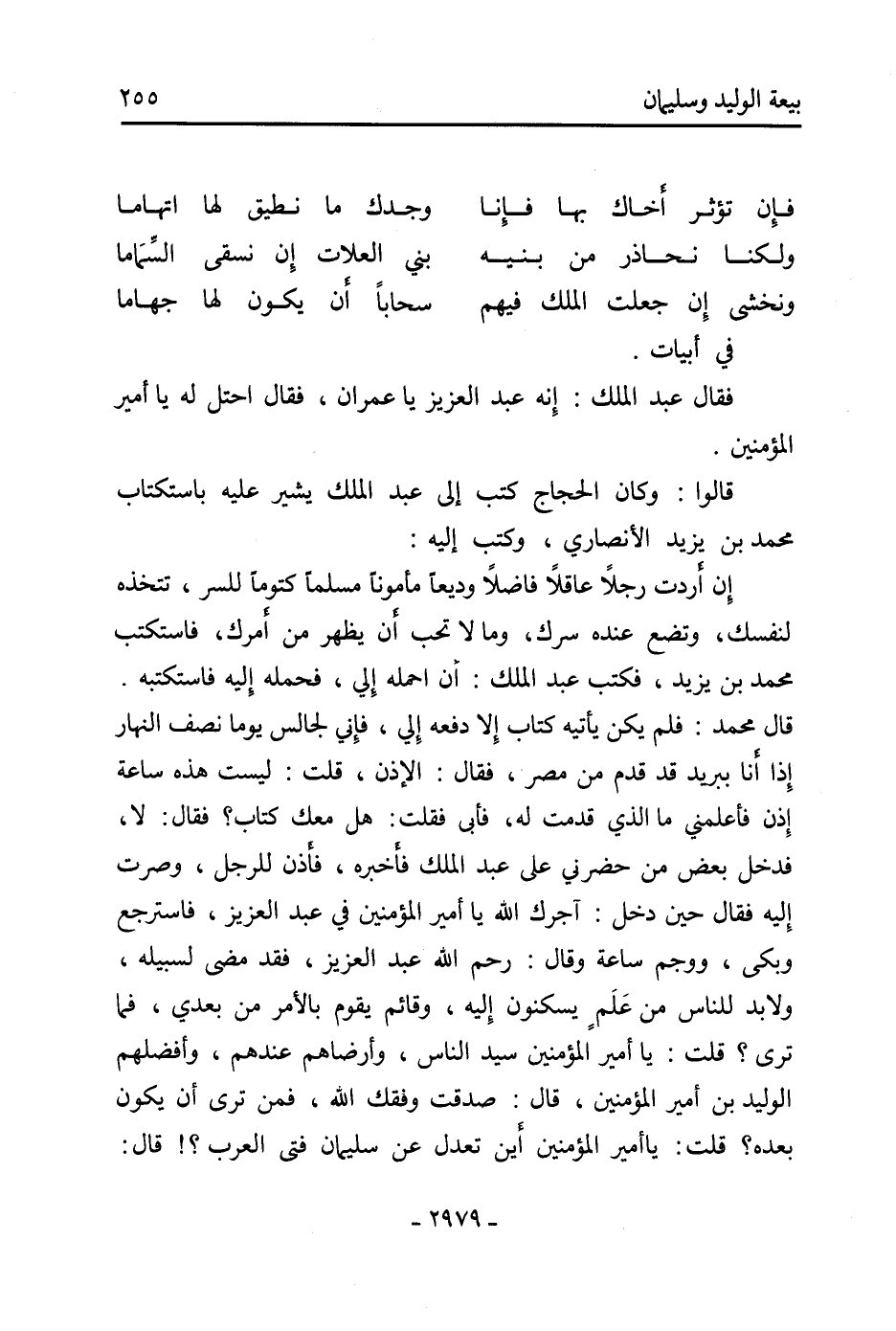 قَالَ مُحَمَّد: فلم يكن يأتيه كتاب إلا دفعه إلي، فإني لجالس يوما نصف النهار إذا أنا ببريد قد قدم من مصر، فَقَالَ: الإذن، قلت: ليست هذه ساعة إذن فأعلمني مَا الَّذِي قدمت لَهُ، فأبى فقلت: هل معك كتاب؟ فَقَالَ: لا، فدخل بعض من حضرني عَلَى عَبْد الْمَلِكِ فأخبره، فأذن للرجل، وصرت إِلَيْهِ فَقَالَ حين دخل: آجرك اللَّه يَا أَمِيرَ الْمُؤْمِنِينَ فِي عَبْد العزيز، فاسترجع وبكى، ووجم ساعة وَقَالَ: رحم اللَّه عَبْد العزيز، فقد مضى لسبيله، ولا بد للناس من علم يسكنون إِلَيْهِ، وقائم يقوم بالأمر من بعدي، فما ترى؟ قلت: يَا أَمِيرَ الْمُؤْمِنِينَ سيد الناس، وأرضاهم عندهم، وأفضلهم الوليد بن أَمِير الْمُؤْمِنِينَ، قَالَ: صدقت وفقك اللَّه، فمن ترى أن يكون بعده؟ قلت: يَا أَمِيرَ الْمُؤْمِنِينَ أين تعدل عَن سليمان فتى العرب؟! قال: