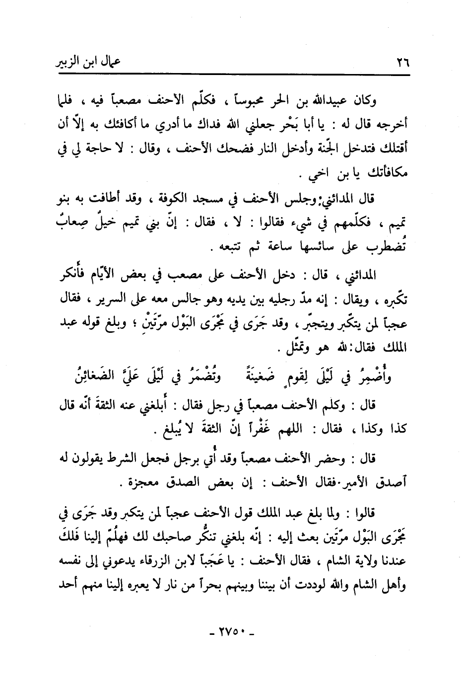 قَالَ: وكلم الأحنف مصعبا فِي رجل فَقَالَ: أبلغني عنه الثقة أنه قَالَ كذا وكذا، فَقَالَ: اللهم غفرا إن الثقة لا يبلغ.