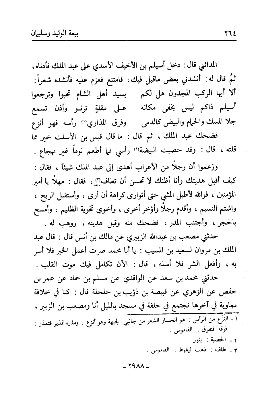 فضحك عَبْد الْمَلِكِ، ثُمَّ قَالَ: مَا قَالَ قيس بْن الأسلت خير مما قلته، قَالَ: وقد حصبت البيضة [2] رأسي فما أطعم نوما غير تهجاع.