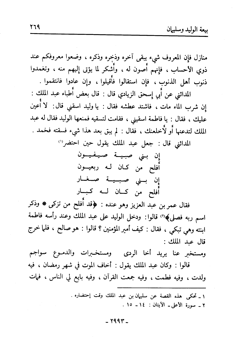 فَقَالَ عمر بْن عَبْد العزيز وهو عنده: قَدْ أَفْلَحَ مَنْ تَزَكَّى. وَذَكَرَ اسْمَ رَبِّهِ فصلى [2] قالوا: ودخل الوليد عَلَى عَبْد الْمَلِكِ وعند رأسه فاطمة ابنته وهي تبكي، فَقَالَ: كيف أَمِير الْمُؤْمِنِينَ؟ قالوا: هو صالح، فلما خرج قَالَ عَبْد الْمَلِكِ: