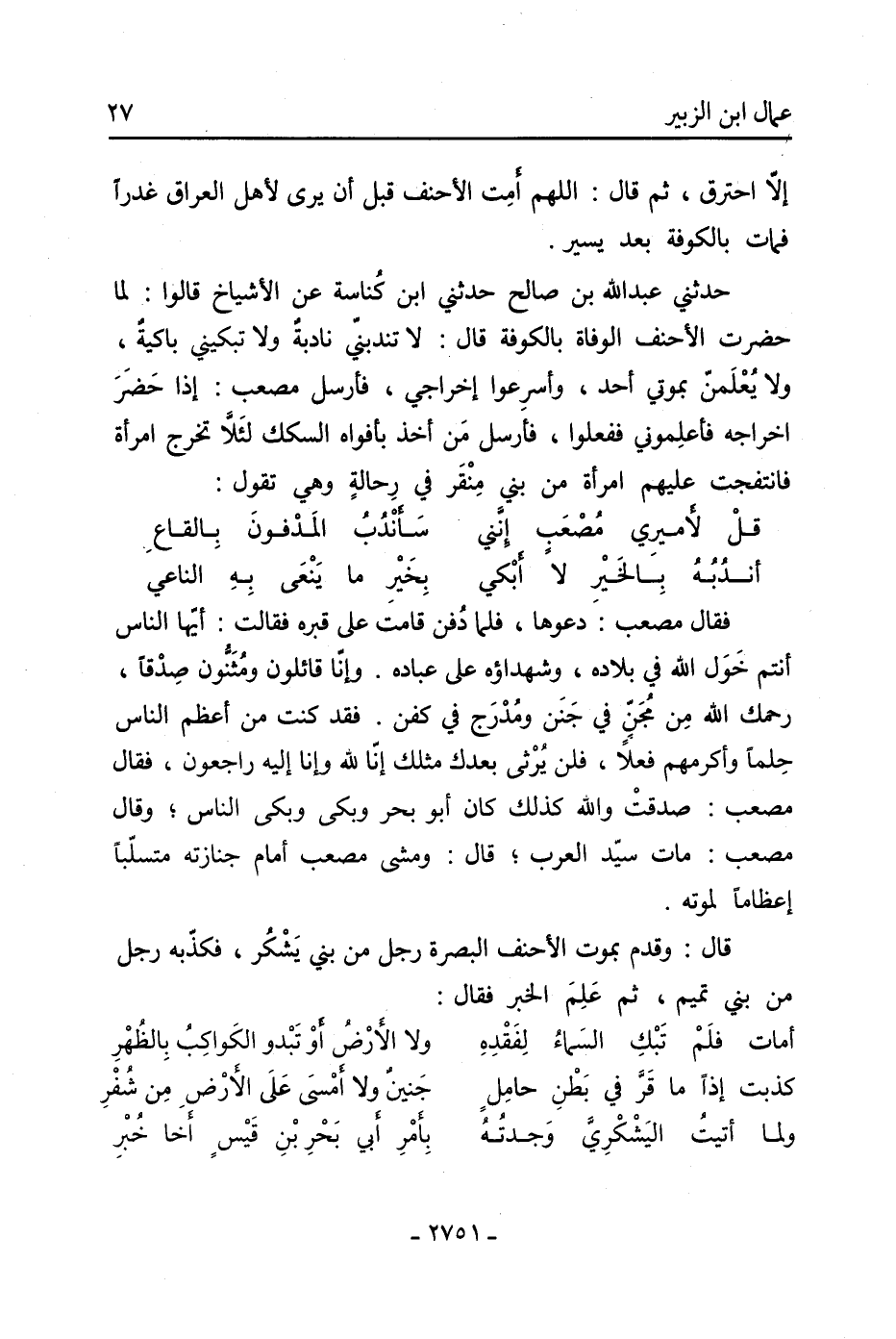 حَدَّثَنِي عَبْدُ اللَّهِ بْن صالح حدثني ابْن كناسة عَن الأشياخ قالوا: لما حضرت الأحنف الوفاة بالكوفة قَالَ: لا تندبني نادبة ولا تبكيني باكية، ولا يعلمن بموتي أحد، وأسرعوا إخراجي، فأرسل مصعب: إذا حضر إخراجه فأعلموني ففعلوا، فأرسل من أخذ بأفواه السكك لئلا تخرج امرأة فانتفجت عليهم امرأة من بني منقر فِي رحالة وهي تقول:
