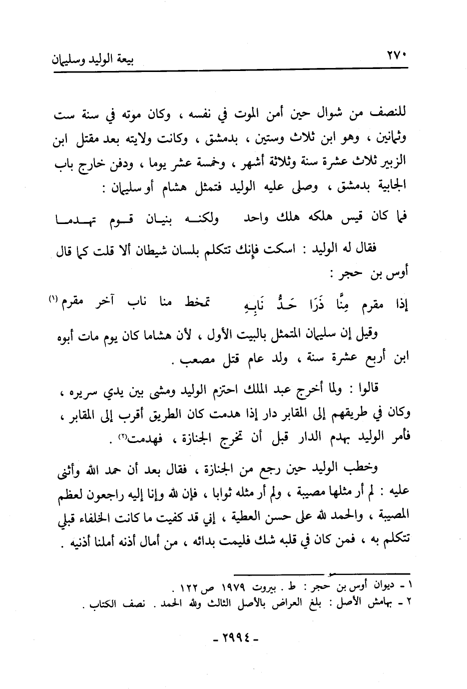 فَقَالَ لَهُ الوليد: اسكت فإنك تتكلم بلسان شيطان ألا قلت كما قَالَ أوس بْن حجر: