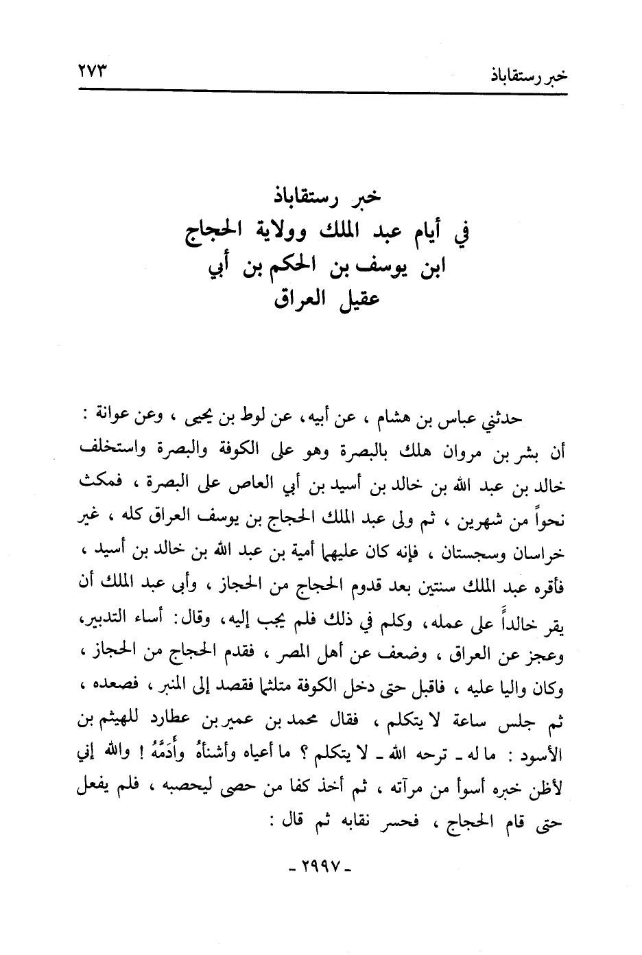 خبر رستقاباذ فِي أيام عَبْد الْمَلِكِ وولاية الحجاج ابْن يوسف بْن الحكم بْن أَبِي عقيل العراق