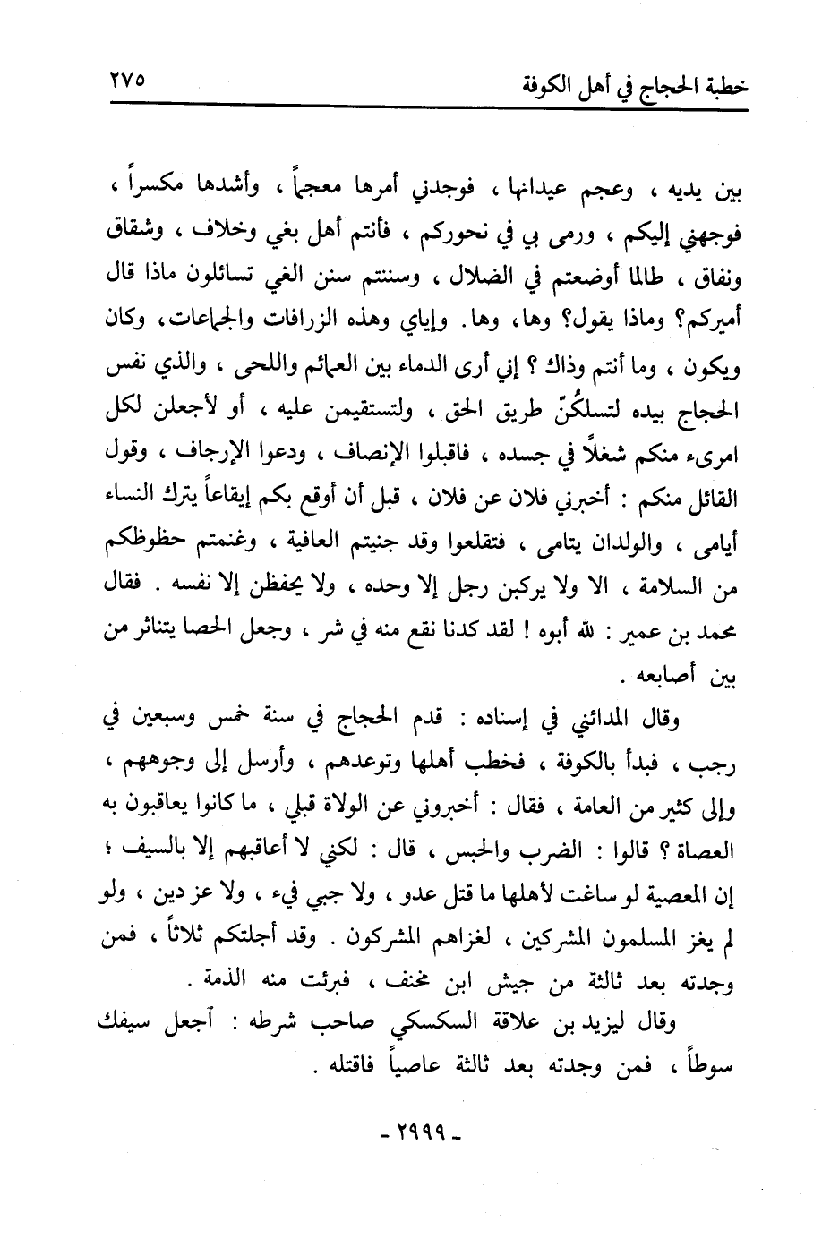 وَقَالَ الْمَدَائِنِيّ فِي إسناده: قدم الحجاج فِي سنة خمس وسبعين فِي رجب، فبدأ بالكوفة، فخطب أهلها وتوعدهم، وأرسل إِلَى وجوههم، وإلى كثير من العامة، فَقَالَ: أخبروني عَن الولاة قبلي، مَا كانوا يعاقبون بِهِ العصاة؟ قالوا: الضرب والحبس، قَالَ: لكني لا أعاقبهم إلا بالسيف، إن المعصية لو ساغت لأهلها مَا قتل عدو، ولا جبي فيء، ولا عز دين، ولو لم يغز المسلمون المشركين، لغزاهم المشركون. وقد أجلتكم ثلاثا، فمن وجدته بعد ثالثة من جيش ابْن مخنف، فبرئت منه الذمة.