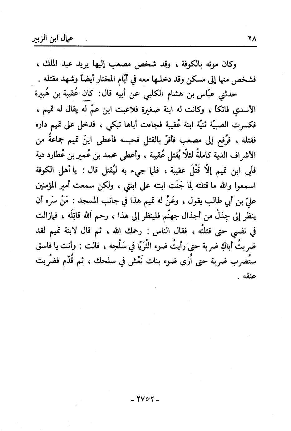 حَدَّثَنِي عَبَّاس بْن هِشَام الْكَلْبِيّ عَن أبيه قَالَ: كَانَ عقيبة بْن هبيرة الأسدي فاتكا، وكانت لَهُ ابنة صغيرة فلاعبت ابن عمّ له يقال له تميم، فكسرت الصبية ثنية ابنة عقيبة فجاءت أباها تبكي، فدخل عَلَى تميم داره فقتله، فرفع إِلَى مصعب فأقر بالقتل فحبسه فأعطى ابْن تميم جماعة من الأشراف الدية كاملة لئلا يقتل عقيبة، وأعطى مُحَمَّد بْن عمير بْن عطارد دية فأبى ابْن تميم إلا قتل عقيبة، فلما جيء بِهِ ليقتل قَالَ: يَا أَهْل الْكُوفَة اسمعوا والله مَا قتلته لما جنت ابنته عَلَى ابنتي، ولكن سمعت أَمِير الْمُؤْمِنِينَ علي بْن أَبِي طالب يقول، وعن لَهُ تميم هذا في جانب المسجد [من سره أن ينظر إِلَى جذل من أجذال جهنم فلينظر إِلَى هذا، رحم اللَّه قاتله،] فما زالت فِي نفسي حَتَّى قتلته، فَقَالَ النَّاس: رحمك اللَّه، ثُمَّ قَالَ لابنة تميم لقد ضربت أباك ضربة حَتَّى رأيت ضوء الثريا فِي سلحه، قالت وأنت يَا فاسق ستضرب ضربة حَتَّى أرى ضوء بنات نعش فِي سلحك، ثُمَّ قدم فضربت عنقه.
