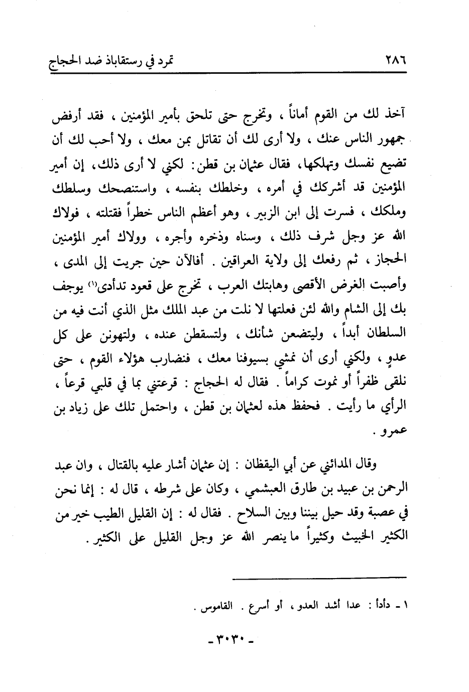 آخذ لك من القوم أمانا، وتخرج حَتَّى تلحق بأَمِير الْمُؤْمِنِينَ، فقد أرفض جمهور النَّاس عنك، ولا أرى لك أن تقاتل بمن معك، ولا أحب لك أن تضيع نفسك وتهلكها، فَقَالَ عثمان بْن قطن: لكني لا أرى ذَلِكَ، إن أَمِير الْمُؤْمِنِينَ قد أشركك فِي أمره، وخلطك بنفسه، واستنصحك وسلطك وملكك، فسرت إِلَى ابْن الزُّبَيْرِ، وهو أعظم النَّاس خطرا فقتلته، فولاك اللَّه عز وجل شرف ذَلِكَ، وسناه وذخره وأجره، وولاك أَمِير الْمُؤْمِنِينَ الحجاز، ثُمَّ رفعك إِلَى ولاية العراقين. أفالآن حين جريت إِلَى المدى، وأصبت الغرض الأقصى وهابتك العرب، تخرج عَلَى قعود تدأدى [1] يوجف بك إِلَى الشام والله لئن فعلتها لا نلت من عَبْد الْمَلِكِ مثل الَّذِي أنت فيه من السلطان أبدا، وليتضعن شأنك، ولتسقطن عنده، ولتهونن عَلَى كل عدو، ولكني أرى أن نمشي بسيوفنا معك، فنضارب هؤلاء القوم، حَتَّى نلقى ظفرا أو نموت كراما. فَقَالَ لَهُ الحجاج: قرعتني بما فِي قلبي قرعا، الرأي مَا رأيت. فحفظ هذه لعثمان بْن قطن، واحتمل تلك عَلَى زياد بْن عَمْرو.