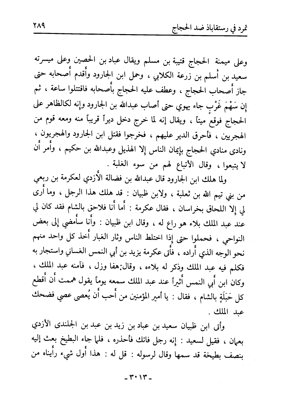 وعلى ميمنة الحجاج قتيبة بْن مسلم ويقال عباد بْن الحصين وعلى ميسرته سعيد بْن أسلم بْن زرعة الكلابي، وحمل ابْن الجارود وأقدم أصحابه حَتَّى جاز أصحاب الحجاج، وعطف عَلَيْهِ الحجاج بأصحابه فاقتتلوا ساعة، ثُمَّ إن سهم غرب جاء يهوي حَتَّى أصاب عَبْد اللَّهِ بْن الجارود وإنه لكالظاهر عَلَى الحجاج فوقع ميتا، ويقال إنه لما خرج دخل ديرا قريبا منه ومعه قوم من الهجريين، فأحرق الدير عليهم، فخرجوا فقتل ابْن الجارود والهجريون، ونادى منادي الحجاج بإيمان الناس إلا الهذيل وعبد الله بن حكيم، وأمر أن لا يتبعوا، وَقَالَ الأتباع لهم من سوء الغلبة.