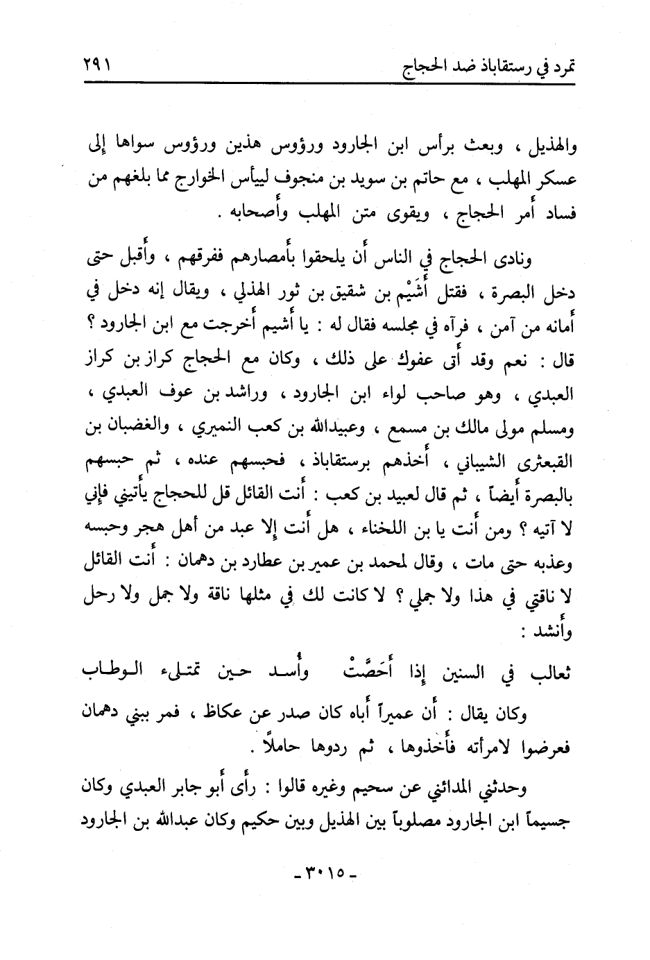 قَالَ: نعم وقد أتى عفوك عَلَى ذَلِكَ، وَكَانَ مَعَ الحجاج كراز بْن كراز العبدي، وهو صاحب لواء ابْن الجارود، وراشد بْن عوف العبدي، ومسلم مولى مالك بْن مسمع، وعبيد اللَّه بْن كعب النميري، والغضبان بْن القبعثرى الشيباني، أخذهم برستقاباذ، فحبسهم عنده، ثُمَّ حبسهم بالبصرة أيضا، ثُمَّ قَالَ لعبيد بْن كعب: أنت القائل قل للحجاج يأتيني فإني لا آتيه؟ ومن أنت يا بن اللخناء، هل أنت إلا عبد من أَهْل هجر وحبسه وعذبه حَتَّى مات، وَقَالَ لمحمد بْن عمير بْن عطارد بْن دهمان: أنت القائل لا ناقتي فِي هذا ولا جملي؟ لا كانت لك فِي مثلها ناقة ولا جمل ولا رحل وأنشد:
