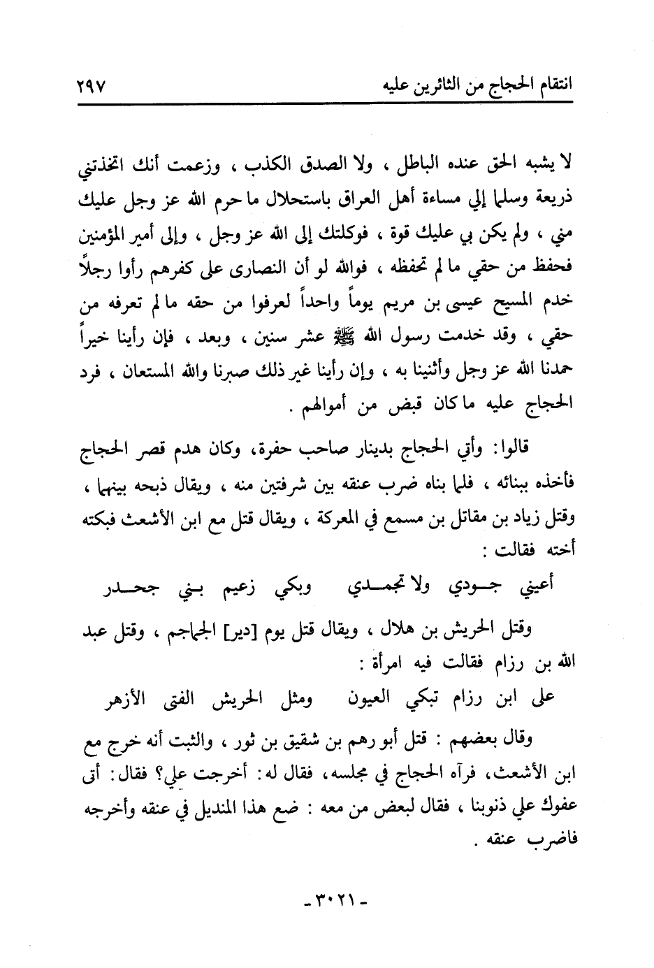 وقتل الحريش بْن هلال، ويقال قتل يوم (دير) الجماجم، وقتل عَبْد اللَّهِ بْن رزام فقالت فيه امرأة: