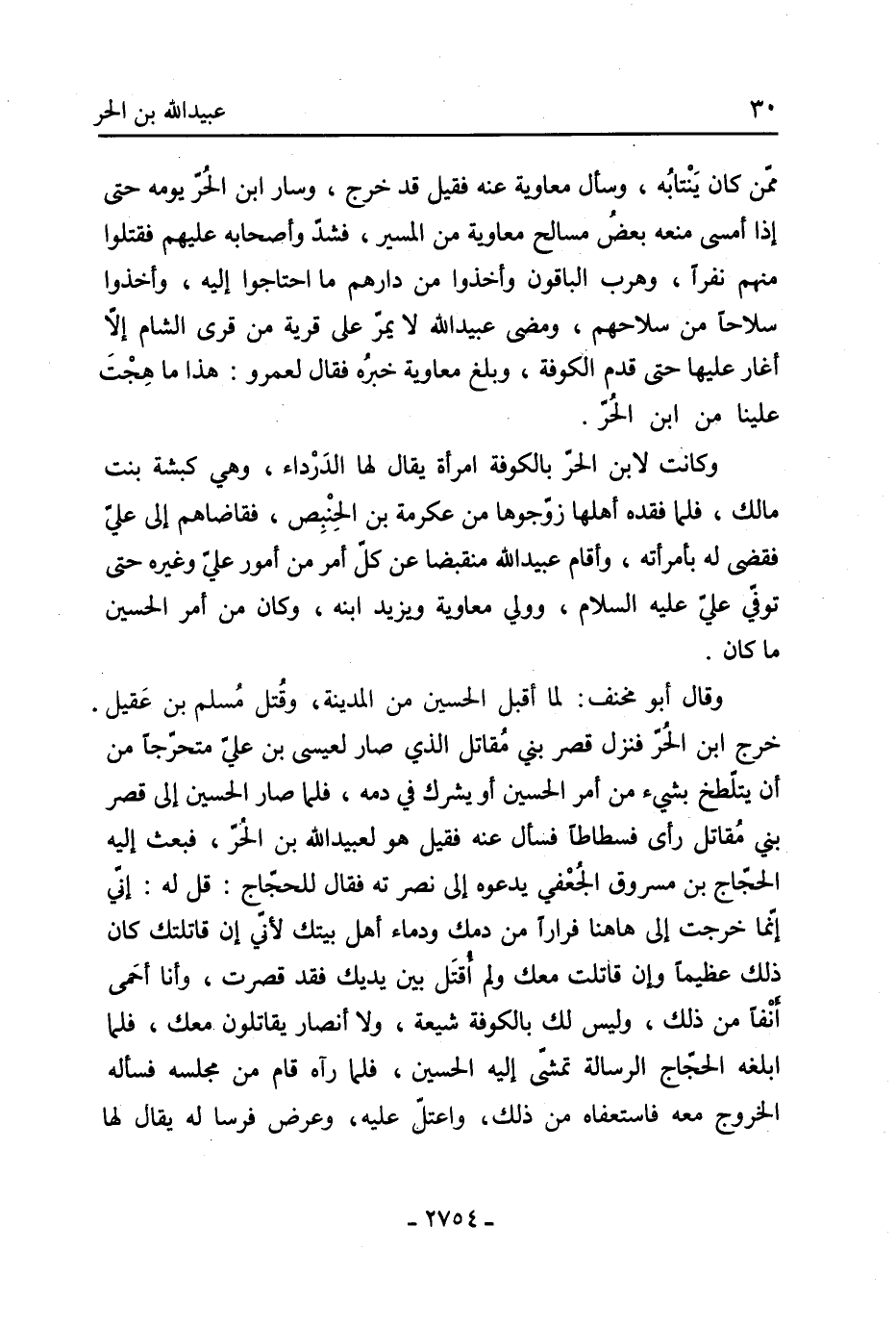 مِمَّن كَانَ يَنْتَابُهُ، وَسَأَلَ مُعَاوِيَةُ عَنْهُ فَقِيلَ قَدْ خَرَجَ، وَسَارَ ابْنُ الْحُرِّ يَوْمَهُ حَتَّى إِذَا أَمْسَى مَنَعَهُ بَعْضُ مَسَالِحِ مُعَاوِيَةَ مِنَ المسير، فشدّوا أصحابه عَلَيْهِمْ فَقَتَلُوا مِنْهُمْ نَفَرًا، وَهَرَبَ الْبَاقُونَ وَأَخَذُوا مِنْ دَارِهِمْ مَا احْتَاجُوا إِلَيْهِ، وَأَخَذُوا سِلاحًا مِنْ سِلاحِهِمْ، وَمَضَى عُبَيْدُ اللَّهِ لا يَمُرُّ عَلَى قَرْيَةٍ مِنْ قُرَى الشَّامِ إِلا أَغَارَ عَلَيْهَا حَتَّى قَدِمَ الْكُوفَةَ، وَبَلَغَ مُعَاوِيَةَ خَبَرُهُ فَقَالَ لِعَمْرٍو: هَذَا مَا هِجْتَ عَلَيْنَا مِنَ ابْنِ الْحُرِّ.
