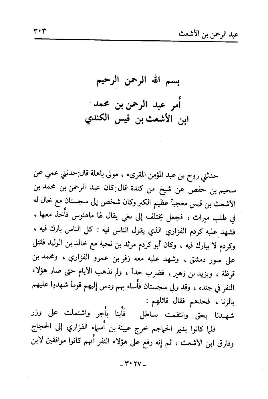 حَدَّثَنِي روح بْن عَبْد المؤمن المقرئ، مولى باهلة قَالَ: حَدَّثَنِي عمي عَن سحيم بْن حفص عَن شيخ من كندة قَالَ: كَانَ عَبْد الرَّحْمَنِ بْن مُحَمَّد بْن الأشعث بْن قيس معجبا عظيم الكبر وَكَانَ شخص إِلَى سجستان مَعَ خال لَهُ فِي طلب ميراث، فجعل يختلف إِلَى بغي يقال لها ماهنوس فأخذ مَعَهَا، فشهد عَلَيْهِ كردم الفزاري الَّذِي يقول النَّاس فيه: كل النَّاس بارك فِيهِ، وكردم لا يبارك فيه، وَكَانَ أَبُو كردم مرثد بْن نجبة مَعَ خالد بْن الوليد فقتل عَلَى سور دمشق، وشهد عَلَيْهِ مَعَهُ زفر بْن عَمْرو الفزاري، ومحمد بْن قرظة، ويزيد بْن زهير، فضرب حدا، ولم تذهب الأيام حَتَّى صار هؤلاء النفر فِي جنده، وقد ولي سجستان فأساء بهم ودس إليهم قوما شهدوا عليهم بالزنا، فحدهم فَقَالَ قائلهم: