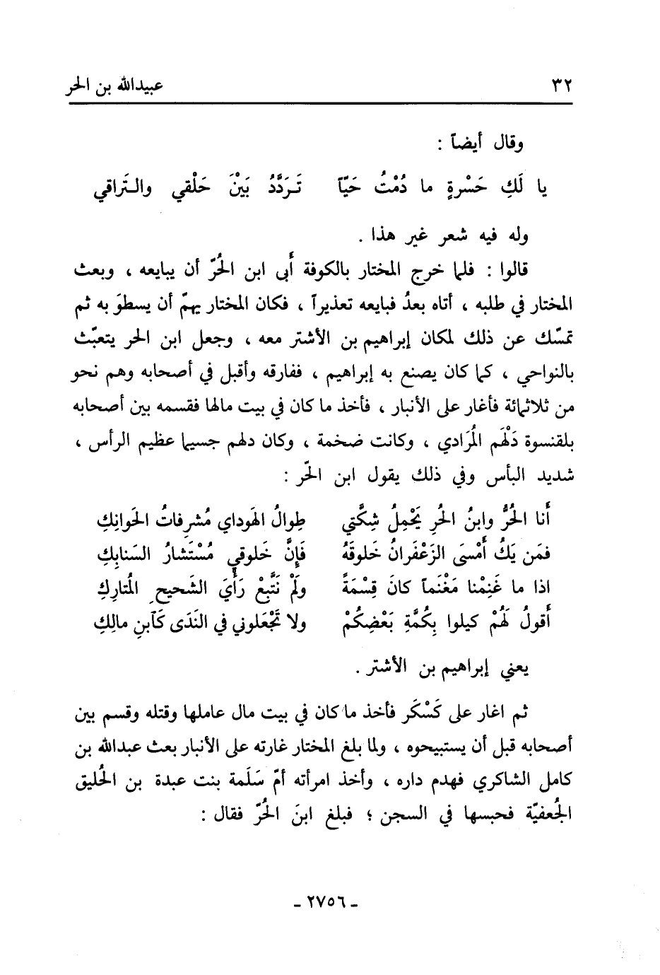 ثُمَّ أغار عَلَى كسكر فأخذ مَا كَانَ فِي بيت مال عاملها وقتله وقسم بين أصحابه قبل أن يستبيحوه، ولما بلغ المختار غارته عَلَى الأنبار بعث عَبْد اللَّهِ بْن كامل الشاكري فهدم داره، وأخذ امرأته أم سلمة بنت عبدة بْن الحليق الجعفية فحبسها فِي السجن، فبلغ ابْن الحر فقال:
